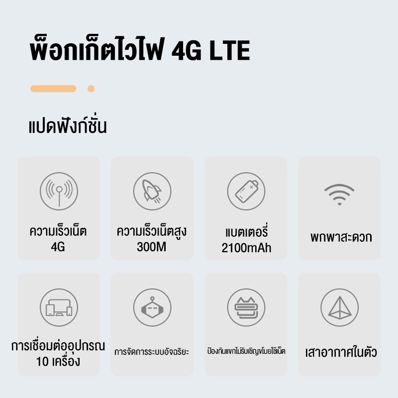 ... ckly! ✨ Please consult our customer service! 📦สินค้าทั้งหมดอยู่ในประเทศไทยจัดส่งรวดเร็วและคุณภาพดี 🚚จะสินค้าจะมาถึงลูกค้าประมาณ 1-2 วันในกรุงเทพและ 3-4 วันในต่างจังหวัด # ไม่นับวันหยุดนักขัตฤกษ์และวันอาทิตย์ ✨สินค้ารับประกัน 3 ปี และหากมีปัญหาภายใน 3 ปี สามารถส่งกลับมายังศูนย์บริการในกรุงเทพฯ เพื่อเปลี่ยนให้ฟรี ทางร้านรับผิดชอบลูกค้าทุกท่าน 📣ติดตามเรา รับคูปองพิเศ รีวิว 5 ดาว ลุ้นรับของสมนาคุณฟรี🔧 📣สินค้าทุกชิ้นของทางร้าน เป็นสินค้าใหม่ จากโรงงาน ราคาประหยัดย่อมเยา 📣หากมีปัญหากับผลิตภัณฑ์โปรดติดต่อฉันในครั้งแรกฉันจะช่วยคุณแก้ปัญหา รุ่นใหม่ R2 รองรับทุกซิม ● วิธีการตั้งค่าอุปกรณ์ WIFI: ● ถอดฝาครอบด้านหลังออก ● ใส่ซิมการ์ดที่ใหญ่ที่สุด (ใช้ช่องเสียบซิมการ์ดที่เรามีให้) ● แกะกาวฉนวนสีเขียวออกจากขั้วต่อแบตเตอรี่แล้วใส่ลงในอุปกรณ์ ● เปิดเครื่องและค้นหาสัญญาณ WIFI จากสมาร์ทโฟน ● คลิก เชื่อมต่อ ชื่อ WIFI เริ่มต้นคือ 4G MIFI-XXXX ● รหัสผ่านเริ่มต้นคือ 1234567890 ● หลังจากเชื่อมต่อ หากคุณต้องการแก้ไขรหัสผ่านและชื่อ WIFI โปรดใช้เบราว์เซอร์ของสมาร์ทโฟนที่เชื่อมต่อของคุณและพิมพ์ที่อยู่ต่อไปนี้: ● เข้าสู่ระบบเว็บไซต์ 192.168.0.1 ● ชื่อผู้ใช้: admin ● รหัสผ่าน : admin ● แก้ไข WIFI-แก้ไข SSID-ป้อนรหัสผ่านใหม่-บันทึก ● แจ้งเตือนได้ได้รับเครื่องเบิกไม่ติด ต้องเช็คดูแบตก่อนนะคะ แบตตรงนั้นมีการฉนวนติดด้วย ต้องฉีกกาวออกจะชาร์จเข้าได้นะคะ ● 4G Pocket WiFi 4Gแบบพกพา ใช้4Gได้ทุกค่าย ● ใส่ซิมแล้วใช้งานได้ทันที ไม่ต้องตั้งค่าให้ยุ่งยาก ● รองรับการเชื่อมต่อWiFiพร้อมกัน20เครื่อง ● รองรับ4G/LTE FDD: 2100/1800/900/800/850 MHz ● รองรับ3G/DC-HSPA+/HSPA+/HSPA/UMTS: 2100/1900/900/850 MHz ● รองรับ2G/EDGE/GPRS/GSM: 1900/1800/900/850 MHz ● ความเร็วเตาหลอม 300Mbps บนเครือข่าย4G/LTE FDD (MAX) ● ความเร็วเตาหลอม 60Mbpsบนเครือข่าย3G/HSPA+/DC-HSPA+ (MAX) ● รองรับWiFi b/g/nบน2.4Ghzใช้งานได้พร้อมกัน15เครื่อง ● รองรับSecurityแบบWEP/WPA-PSK/WPA2-PSKเป็นสิน สามารถใช้งานได้ 4-5 วันเมื่อชาร์จเต็ม