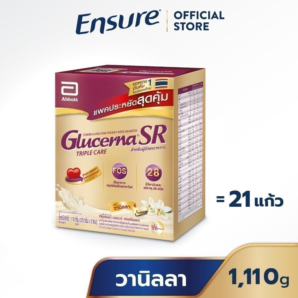 กลูเซอนา เอสอาร์ ทริปเปิ้ลแคร์ ชนิดผง กลิ่นวานิลลา อาหารทดแทนหรืออาหารระหว่างมื้อ สูตรครบถ้วน ผสมใยอาหาร ใช้รับประทานแทนอาหารมื้อหลักหรืออาหารระหว่างมื้อ เพื่อช่วยควบคุมระดับน้ำตาลในผู้ป่วยเบาหวาน คุณสมบัติและส่วนประกอบสำคัญ • ช่วยการย่อยคาร์โบไฮเดรตช้าลง และช่วยควบคุมให้ระดับน้ำตาลอยู่ในระ
