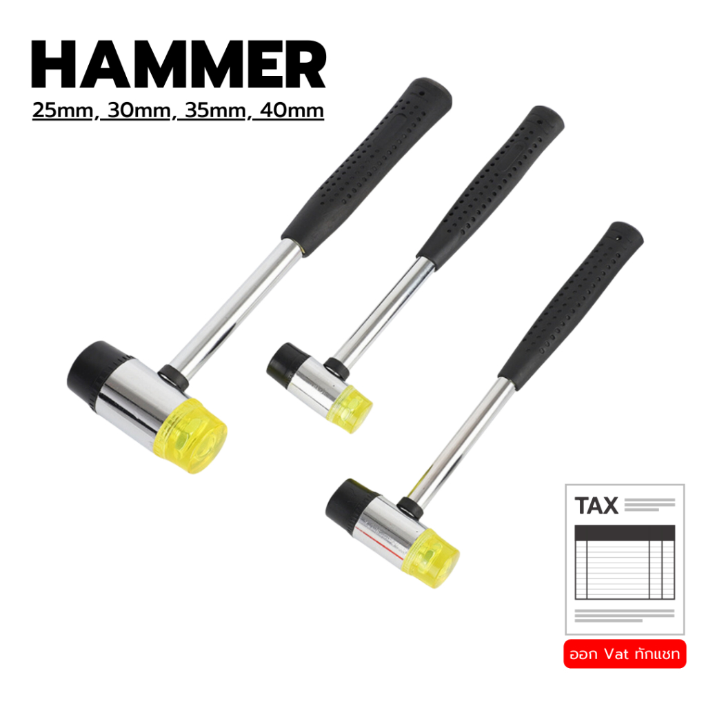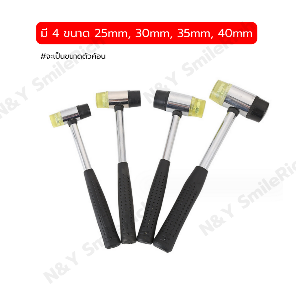 ... ูได้ที่ตัวเลือกสินค้า *** รายละเอียด ▪ หัวค้อนทำมาจากยางคุณภาพสูงทั้ง 2 ด้าน ▪ รหัส #KON1 = 25mm *** Ø หัวเหล็ก 25mm Ø หัวยาง 22.5mm ความยาวทั้งหมด 25 cm ความกว้างหัวค้อน 6.4 cm ความยาวด้าม 22.5 cm ▪ รหัส #KON2 = 30mm *** Ø หัวเหล็ก 30mm Ø หัวยาง 26mm ความยาวทั้งหมด 26 cm ความกว้างหัวค้อน 7.5 cm ความยาวด้าม 24 cm ▪ รหัส #KON3 = 35mm *** Ø หัวเหล็ก 35mm Ø หัวยาง 30mm ความยาวทั้งหมด 26 cm ความกว้างหัวค้อน 8.1 cm ความยาวด้าม 22.5 cm ▪ รหัส #KON4 = 40mm *** Ø หัวเหล็ก 40mm Ø หัวยาง 35mm ความยาวทั้งหมด 30 cm ความกว้างหัวค้อน 9.3 cm ความยาวด้าม 26 cm รายละเอียดขนาดจะใกล้เคียงตามนี้ โดยวัดจากของจริง -------------------------------------------------- ▪ สามารถออกใบกำกับภาษีได้ โดยใส่รายละเอียดไว้ช่อง "หมายเหตุ" หน้าคำสั่งซื้อ หรือแจ้งผ่านทางแชทได้เลย -------------------------------------------------- **สินค้าพร้อมส่ง** วันและเวลาทำการของบริษัท จันทร์-เสาร์ : 9.00-17.00 น. วันอาทิตย์ : ปิดทำการ วันหยุดนักขัตฤกษ์ และ วันสำคัญทางศาสนา : ปิดทำการ --------------------------------------------------- วันและเวลาในการจัดส่งสินค้า ทำการจัดส่งสินค้าทุกวันโดย. กรุงเทพและปริมณฑล ประมาณ1-2วัน จังหวัดอื่นๆ ไม่เกิน3วัน --------------------------------------------------- บริษัทขนส่ง Shopee Express - (น้ำหนักไม่เกิน 20kg)