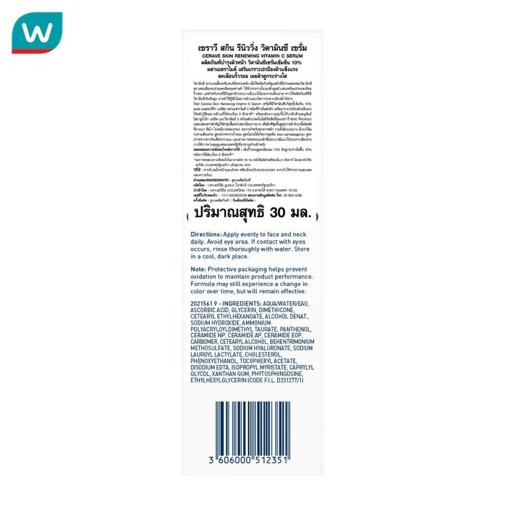... แอซิด และวิตามินบี 5 พร้อมด้วยเทคโนโลยีลิขสิทธิ์ของเซราวี MVE ที่จะค่อยๆ ปลดปล่อยสารสำคัญให้ผิวชุ่มชื้นอย่างต่อเนื่องยาวนาน เพื่อผิวที่ชุ่มชื้นดูสุขภาพดี ด้วยเนื้อสัมผัสที่บางเบา ซึมไว ไม่เหนียวเหนอะหนะ เหมาะสำหรับทุกสภาพผิว รวมถึงผิวบอบบางมีแนวโน้มแพ้ง่าย สูตรปราศจากน้ำหอม สูตรไม่ก่อให้เกิดการอุดตัน (noncomedogenic) สูตรปราศจากสารกันเสียพาราเบน และผ่านการทดสอบบนผิวที่บอบบางมีแนวโน้มระคายเคืองง่าย ภายใต้การควบคุมดูแลของแพทย์ผู้เชี่ยวชาญด้านผิวหนัง vitamin c แหล่งกำเนิด ประเทศสหรัฐอเมริกา เลขที่ใบรับแจ้ง 10-2-6500003298 วิธีการใช้งาน ทาบริเวณใบหน้าและลำคอ หลีกเลี่ยงบริเวณรอบดวงตา ควรเก็บให้ห่างจากแสงแดดและความร้อน ส่วนประกอบ วิตามินซีบริสุทธิ์เข้มข้น 10 เซราไมด์ ไฮยาลูโรนิก แอซิด วิตามินบี 5 คำเตือน Avoid the eye area. If contact with your eyes occurs, rinse them thoroughly with water. Store in a cool, dark place