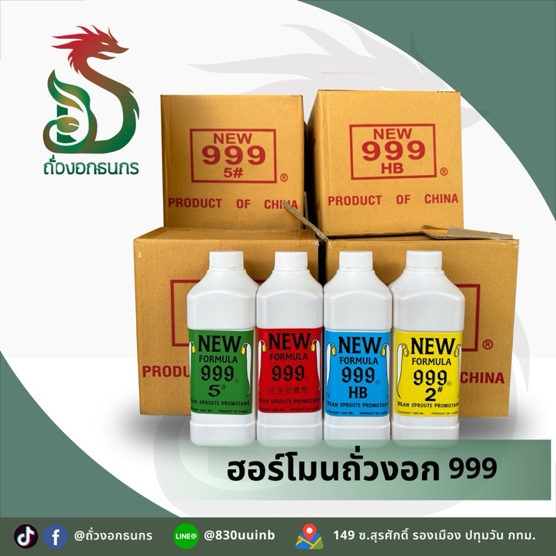 ... 9 [สีแดง] = ช่วยทำให้ถั่วงอกมีรากสั้น และจะทำให้ถั่วงอกมีน้ำหนักมากขึ้น ใช้สำหรับแช่กัดรากเมล็ดถั่วงอก **ใช้สำหรับรดปุ๋ยครั้งแรกและครั้งที่สอง** 3. New Formula 999 [สีฟ้า] = ทำให้ลำต้นมีลักษณะ ลำต้นยาว มีน้ำหนักมากขึ้น 4. New Formula 999 [สีเหลือง] = ช่วยทำให้เปลือกดำหลุดออกง่ายขึ้นเวลาล้างถั่ว **อัตราส่วน ถั่วงอก 1 กก. = น้ำ 1 ลิตร = ฮอร์โมน 999 2 CC. [รดฮอร์โมนตามวงรอบของปุ๋ยที่ใส่] วิธีใช้งาน 1. รดปุ๋ยครั้งแรก หลังจากที่เพาะถั่วลงถังแล้ว 12 ชม. 2. รดปุ๋ยครั้งที่สอง หลังจากที่ทิ้งไว้ห่างจากครั้งแรก 12 ชม. 3. รดปุ๋ยครั้งที่สาม ทิ้งห่างหลังจากครั้งที่สอง 24 ชม. 4. รดปุ๋ยครั้งที่สี่ ทิ้งห่างจากครั้งที่สาม 24 ชม. **หมายเหตุ** หากต้องการสอบถามรายละเอียดวิธีการใช้งานเพิ่มเติม สามารถสอบถามแอดมิน ผ่านทางแชทกับร้านค้าได้เลยค่ะ หากลูกค้าสนใจสินค้า หรือต้องการสอบถามเพิ่มเติมเกี่ยวกับถั่วงอก วิธีใช้ การใช้ฮอร์โมน หรืออื่นๆ สามารถสอบถามแอดมินผ่านทางการแชทกับร้านค้า หรือสามารถติดตามเพจ FACEBOOK : ถั่วงอก ธนกร @greenbeen.mai สามารถขอคำปรึกษาได้ ฟรี** ทักสอบถามได้ตลอด 24 ชม. ค่ะ