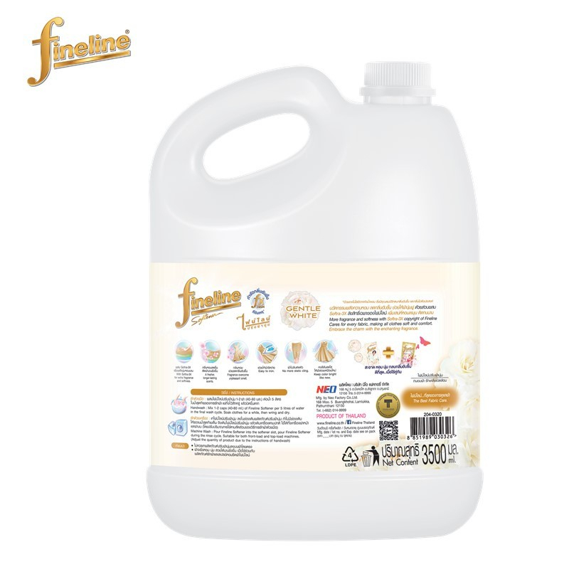 ไฟน์ไลน์ ผลิตภัณฑ์ปรับผ้านุ่ม เจนเทิล ไวท์ 2800 มล. ผลิตภัณฑ์ปรับผ้านุ่มไฟน์ไลน์ พร้อมคืนความหอม คงเส้นใยของผ้านุ่มฟูน่าสัมผัสในทุกๆ วัน นวัตกรรมพลังความหอม ลดกลิ่นอับชื้น ช่วยให้ผ้านุ่มฟู ด้วยส่วนผสม Softra-3X ลิขสิทธ์เฉพาะของไฟน์ไลน์เพิ่มเสน่ห์ติดทนด้วยแคปซูลหอม รายละเอียดสินค้า ส่วนผสมพิ