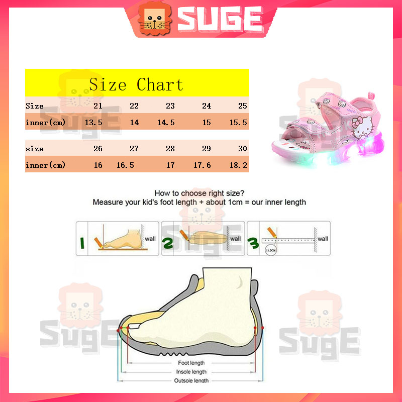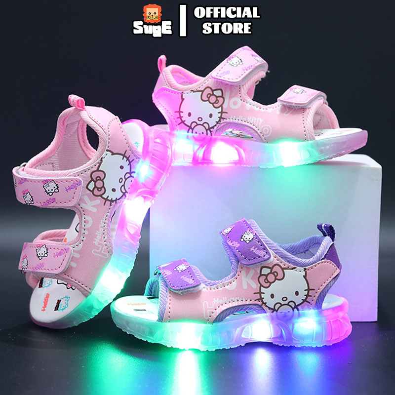 SUGE รองเท้าแตะลําลอง ลายการ์ตูนแมว มีไฟ LED สีชมพู สีม่วง แฟชั่นชายหาด สําหรับเด็ก