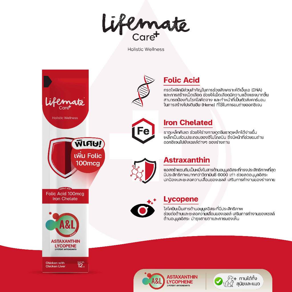 ไลฟ์เมต แคร์ พลัส แคท ทรีต มูสไก่ผสมตับไก่ สูตรบำรุงเลือด เลขทะเบียนอาหารสัตว์ควบคุมเฉพาะเลขที่ 01 09 66 0840 ส่วนประกอบ เนื้อไก่ แป้งมันสำปะหลังดัดแปร ตับไก่ สารปรุงแต่งรส น้ำนึ่งปลาทูน่า กัวร์กัม วิตามิน แร่ธาตุ ไลโคปีน แอสตาแซนทีน ช่วยบำรุงสุขภาพ เสริมสร้างการสร้างเม็ดเลือด บำรุงเลือด เสริมกา