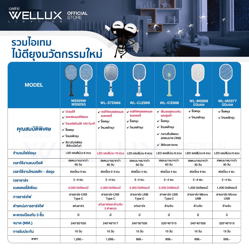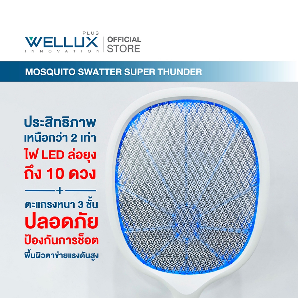 ... แสงสีม่วง 🦟รุ่นใหม่เพิ่มแบตเตอรี่ลิเธียมขึ้นเป็น 2000mAh ใช้งานได้นานขึ้นถึง 60 วัน 🦟หน้าจอ LED แสดงผลเปอร์เซ็นแบตแตอรี่สุดล้ำแบบเป็นดิจิตอล 🦟ปลอดภัยด้วยตาข่าย 3 ชั้น ป้องกันการโดนช็อตมือ 🦟ระบบป้องกันไฟเกินขณะชาร์จ ช่วยยืดอายุการใช้งานแบตเตอรี่ 🦟ไฟล่อยุงแสงสีม่วง 6 ดวง (หากเปิดโหมดล่อยุงจะค่อนข้างกินแบตนะคะ) 🦟วัสดุเกรดพรีเมี่ยมไม่ก็องแก๊ง อายุการใช้งานยาวนาน 🦟แถมแท่นชาร์จและสายUSB- Type C (ไม่มีอะแดปเตอร์แถมให้นะคะ) แนะนำให้ใช้ 18 วัตต์ขึ้นไปค่ะ **เปิดใช้งานโหมดปกติ เปิด-ปิดตียุงธรรมดาแบตจะอยู่ได้นานสูงสุด 60 วัน** **เปิดใช้งานโหมดล่อยุงแสงสีม่วง แบตจะอยู่ได้นานประมาณ 6-8 ชม. (เนื่องจากโหมดนี้จะค่อนข้างกินแบตเพราะมีไฟ LED ล่อยุงมากถึง 6 ดวงค่ะ) --------------------------------------------------------------------------------------------------------------- [รุ่นอัพเกรด]WELLUX ไม้ตียุงอัจฉริยะพร้อมจอ LED ประสิทธิภาพเหนือกว่า 2 เท่า ด้วยไฟล่อยุงแสงสีม่วงถึง 10 ดวง MOSQUITO SWATTER SUPER THUNDER MODEL : WL-STD666 *รับประกัน 15 วัน** การทำงานของเครื่อง OFF = ปิดการทำงาน ON1+ กดปุ่มด้านหน้าสีเทาค้างไว้ = ระบบช๊อตยุงทำงาน ON2 = ระบบช๊อตยุงทำงาน+ไฟล่อยุงแสงสีม่วง 🦟 หน้าปัดขนาดใหญ่ ชาร์จไฟได้ 2 ตำแหน่ง (ด้ามจับ/แท่นชาร์จ) 🦟รุ่นใหม่เพิ่มแบตเตอรี่ลิเธียมขึ้นเป็น 2000mAh ใช้งานได้นานขึ้นถึง 60 วัน 🦟ประสิทธิภาพ 2 เท่าด้วย ไฟล่อยุงแสงสีม่วง 10 ดวง (หากเปิดโหมดล่อยุงจะค่อนข้างกินแบตนะคะ) 🦟หน้าจอ LED แสดงผลเปอร์เซ็นแบตแตอรี่สุดล้ำแบบเป็นดิจิตอล 🦟ปลอดภัยด้วยตาข่าย 3 ชั้น ป้องกันการโดนช็อตมือ 🦟ระบบป้องกันไฟเกินขณะชาร์จ ช่วยยืดอายุการใช้งานแบตเตอรี่ 🦟วัสดุเกรดพรีเมี่ยมไม่ก็องแก๊ง อายุการใช้งานยาวนาน 🦟แถมแท่นชาร์จและสายUSB- Type C (ไม่มีอะแดปเตอร์แถมให้นะคะ) แนะนำให้ใช้ 18 วัตต์ขึ้นไปค่ะ **เปิดใช้งานโหมดปกติ เปิด-ปิดตียุงธรรมดาแบตจะอยู่ได้นานสูงสุด 60 วัน** **เปิดใช้งานโหมดล่อยุงแสงสีม่วง แบตจะอยู่ได้นานประมาณ 6 ชม. (เนื่องจากโหมดนี้จะค่อนข้างกินแบตเพราะมีไฟ LED ล่อยุงมากถึง 10 ดวงค่ะ) Made in PRC นำเข้าและจัดจำหน่ายโดย บริษัท เวลลักซ์ (ประเทศไทย) จำกัด --------------------------------------------------------- การออกใบกำกับภาษี >> ทางร้านจะออกใบกำกับภาษีด้วย ชื่อ-ที่อยู่ จากข้อมูลการจัดส่งสินค้า ที่ลูกค้าได้ลงทะเบียนไว้ในระบบ Shopee >> ต้องการออกใบกำกับภาษีในนาม บริษัท/นิติบุคคล ลูกค้าต้องกรอกข้อมูลเข้ามาในระบบของ Shopee ก่อนกดชำระเงินเท่านั้น >> ทางร้านขอสงวนสิทธิ์ ไม่สามารถออกใบกำกับภาษีให้ใหม่ หรือ แก้ไขย้อนหลังได้ >> หากไม่มีใบกำกับภาษีส่งไปพร้อมสินค้าในกล่องพร้อมสินค้า ร้านจะส่งตามให้ทีหลัง ภายใน 7-14 วันทำการ -------------------------------------------