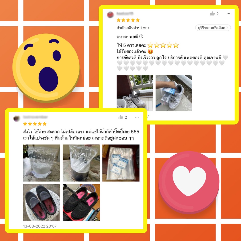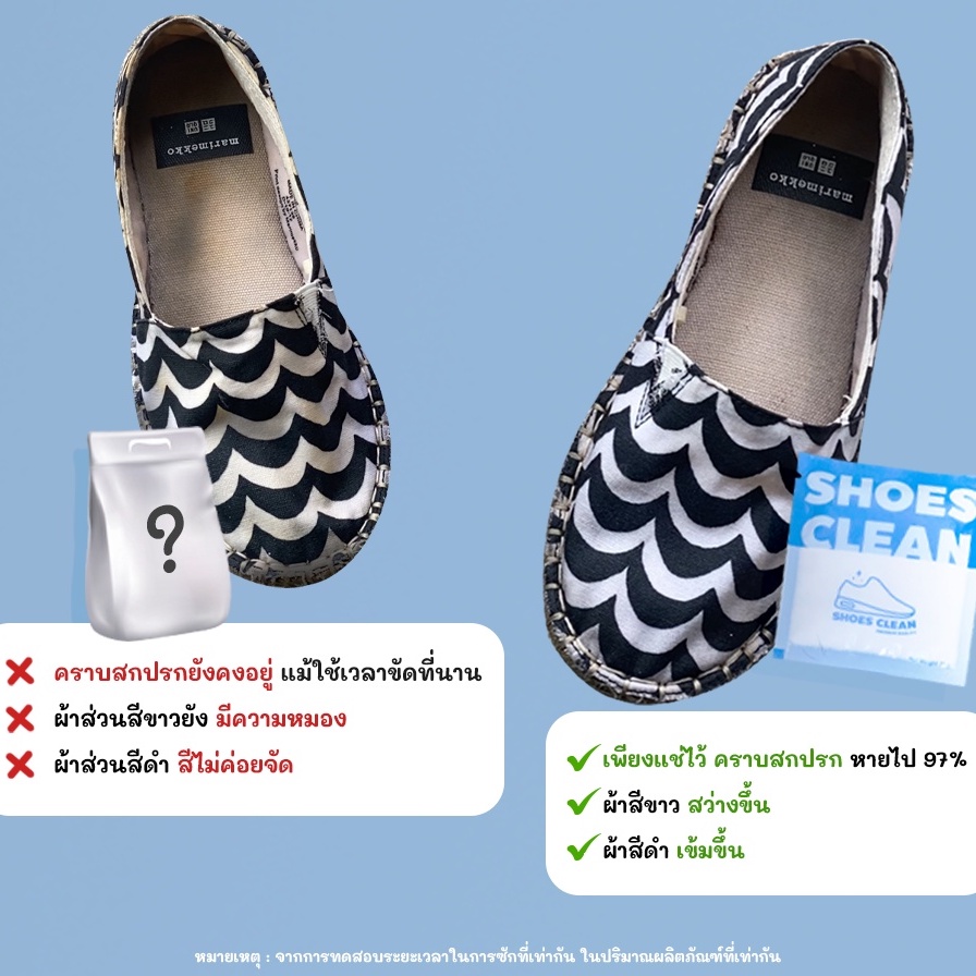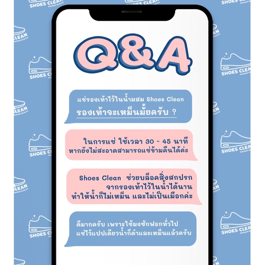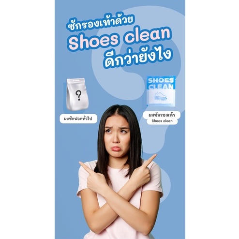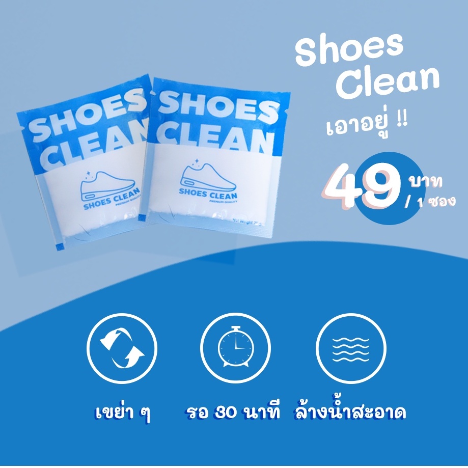 ... ีสารเพิ่มความสดใส ไม่ทำให้รองเท้าซีดจาง ** สามารถซักได้กับรองเท้าผ้าใบทุกสี เพื่อให้สีสดสะอาด ยิ่งขึ้น และไม่ควรซักกับรองเท้าที่ไม่ใช่วัสดุผ้า ** วิธีการใช้ 1. ใส่ผงซักรองเท้า Shoes Clean 1 ซองต่อรองเท้า 1 คู่ ในถุงซิป 2. เติมน้ำให้พอเหมาะกับรองเท้าและเขย่า 3. ใส่รองเท้า 4. ทิ้งไว้ 30-45 นาที 5. ล้างน้ำเปล่า 6. สามารถใช้แปรงช่วยขัดเบาๆได้ในกรณีสิ่งสกปรกฝังแน่น 7. ตากให้แห้ง ข้อควรระวัง 1. ในกรณีที่เคยแพ้ผงซักฟอก หรือมีบาดแผลที่มือความหลีกเลี่ยงการสัมผัสกับผงซักฟอก 2. หลังการสัมผัสควรล้างมือให้สะอาด 3. หากมีอาการแพ้ ควรปรึกษาแพทย์ 4. ควรเก็บให้พ้นจากมือเด็ก