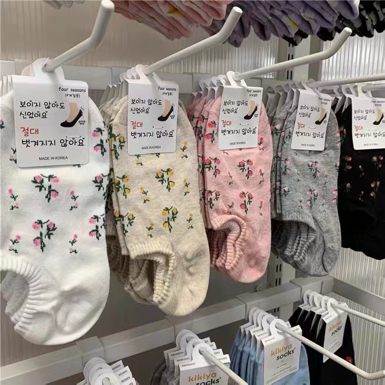 เวอร์ชั่นเกาหลีฤดูใบไม้ผลิและฤดูร้อนถุงเท้าผ้าฝ้ายบาง Hyun Yafeng ลายดอกไม้ขนาดเล็กสไตล์พระปากตื้นถุงเท้าเรือสาวที่มองไม่เห็นป้องกันปิด