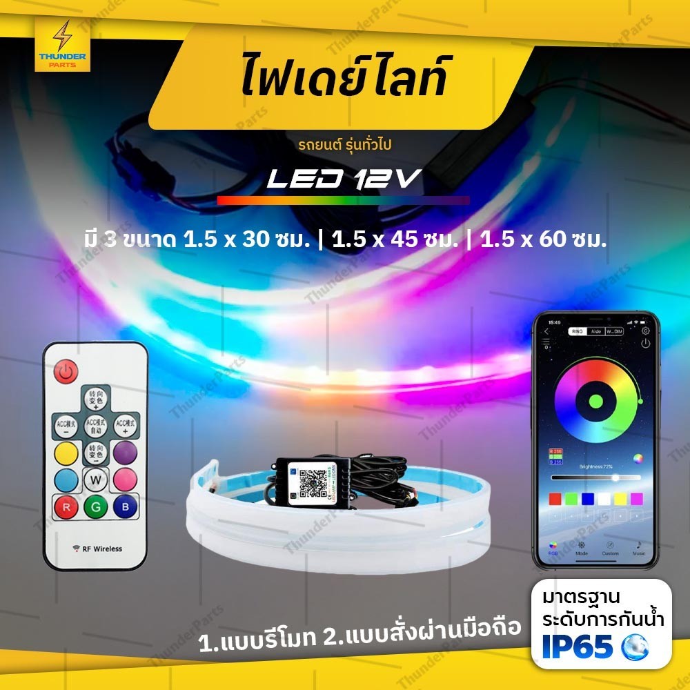 ... ภายใน 7 วัน นับจากวันที่คุณลูกค้าได้รับสินค้า) •หากต้องการแก้ไขที่อยู่ ต้องกดยกเลิกและแล้วสั่งใหม่เท่านั้นครับ •ทันทีที่คุณลูกค้าได้รับสินค้าแล้วเกิดความเสียหาย หากรีวิวสินค้าแล้ว ทางร้านจะไม่รับผิดชอบใดๆ ทั้งสิ้น •หากคุณลูกค้าพบปัญหาในการกดสั่งซื้อสินค้า สามารถติดต่อสอบถามเข้ามาได้ ขอบคุณครับ ข้อมูลจำเฉพาะ ● ชื่อสินค้า: ไฟเดย์ไลท์ ไฟเลี้ยววิ่ง (Candy) ● มี 3 แบบให้เลือก: แบบใช้แอพลิเคชั่นมีไฟเลี้ยว แบบใช้แอพพลิเคชั่นไม่มีไฟเลี้ยว และแบบมีรีโมทมีไฟเลี้ยว ● แรงดันไฟฟ้า: 12V (ใช้ได้เฉพาะ 12V) ● กำลังไฟ: 12W ● กันน้ำ: IP65 ● อายุการใช้งาน: มากกว่า 50,000 hrs. ● วัสดุ: Silicon+LED ● จำนวน: 2ชิ้น / 1กล่อง ● สี: มี 8 สี ในตัวเดียว / RGB ● การใช้งาน: ไฟเดย์ไลท์ ไฟเลี้ยววิ่ง ● รุ่นรถ: รถยนต์ และรุ่นทั่วไป หมายเหตุสำคัญ 1.ไฟเดย์ไลท์ ใช้ติดตั้งกับ รถเก๋ง รถยนต์ 2.ในกรณีที่นำไปดัดแปลงติดตั้งกับรถมอเตอร์ไซค์ ทางร้านจะ "ไม่มีคู่มือวิธีการติดตั้งกับตัวรถให้" เนื่องจากระบบไฟรถมอเตอร์ไซค์แต่ละรุ่นจะไม่เหมือนกัน แนะนำว่า "ควรให้ร้านหรือผู้เชี่ยวชาญทางระบบไฟติดตั้งให้" 3.กรณีไม่ชำนาญเรื่องระบบไฟ แล้วติดตั้งกับมอเตอร์ไซค์ด้วยตนเเอง หากสินค้ามีปัญหา (ทางร้านขอสงวนสิทธิ์ไม่รับผิดชอบทุกกรณี ขอบคุณครับ) วิธีการใช้งาน ● แบบแอพลิเคชั่น (ไม่มีไฟเลี้ยว) สายไฟ 2 เส้น สายสีดำ: สายดิน สายสีแดง: สายไฟ การเชื่อมต่อกับแอพ: ดาวน์โหลดแอพลิเคชั่นลงมือถือ แอพลิเคชั่นชื่อว่า LED LAMP แล้วกดใช้งานได้เลยครับ แบบแอพลิเคชั่น (มีไฟเลี้ยว) สายไฟ 4 เส้น สายสีดำ: สายดิน สายสีแดง: สายไฟ สายสีเหลือง 2 เส้น : ไฟเลี้ยว (ด้านซ้าย LH / ด้านขวา RH) การเชื่อมต่อกับแอพ: ดาวน์โหลดแอพลิเคชั่นลงมือถือ แอพลิเคชั่นชื่อว่า LED LAMP แล้วกดใช้งานได้เลยครับ ● แบบรีโมท สายไฟ 4 เส้น สายสีดำ: สายดิน สายสีแดง: สายไฟ สายสีเหลือง 2 เส้น : ไฟเลี้ยว (ด้านซ้าย LH / ด้านขวา RH) ขนาดสินมีให้เลือก 3 ขนาด •ความยาว: ขนาด 30 ซม. ความกว้าง : ขนาด 1.5 ซม. ความหนา: ขนาด 0.4 มม. •ความยาว: ขนาด 45 ซม. ความกว้าง : ขนาด 1.5 ซม. ความหนา: ขนาด 0.4 มม. •ความยาว: ขนาด 60 ซม. ความกว้าง : ขนาด 1.5 ซม. ความหนา: ขนาด 0.4 มม. รายละเอียดสินค้า ● LED ไฟเดย์ไลท์ ไฟเลี้ยววิ่ง ใช้งานหลากหลาย ● ไฟเดย์ไลท์ มี 3 แบบ ให้เลือก 1. ฟังชั่นการใช้งานด้วยรีโมท 2. ฟังชั่นการใช้งานด้วยโทรศัพท์มือถือ (ไม่มีไฟเลี้ยว) โดยเชื่อมต่อผ่านแอพพลิเคชั่น 3. ฟังชั่นการใช้งานด้วยโทรศัพท์มือถือ (มีไฟเลี้ยว) โดยเชื่อมต่อผ่านแอพพลิเคชั่น ● สำหรับรถยนต์ และรุ่นทั่วไป ● มีสีสันและดูสวยงาม ปรับแสงได้หลายระดับ 1.ฟังชั่นการใช้งานด้วยรีโมท มี 8 สี ในตัวเดียว