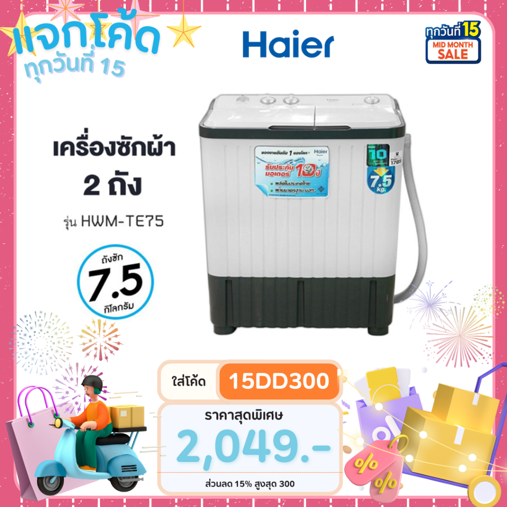 Haier เครื่องซักผ้า 2 ถัง 7.5 Kg รุ่น HWM-TE75 (1 ตัวต่อ 1 คำสั่งซื้อเท่านั้น)