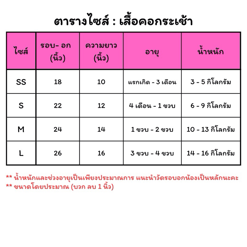 ... ณ 10-13 กิโลกรัม) * L รอบอก 26 นิ้ว, ความยาว 16นิ้ว (3 - 4 ขวบ, น้ำหนักประมาณ 14-16 กิโลกรัม) ***น้ำหนักและช่วงอายุเป็นเพียงประมาณ แนะนำวัดรอบอกน้องเป็นหลักนะคะ***