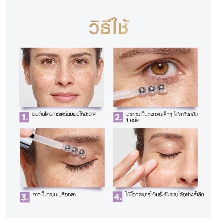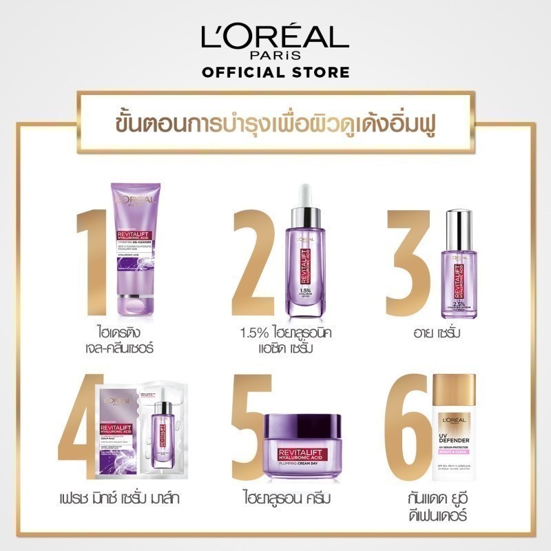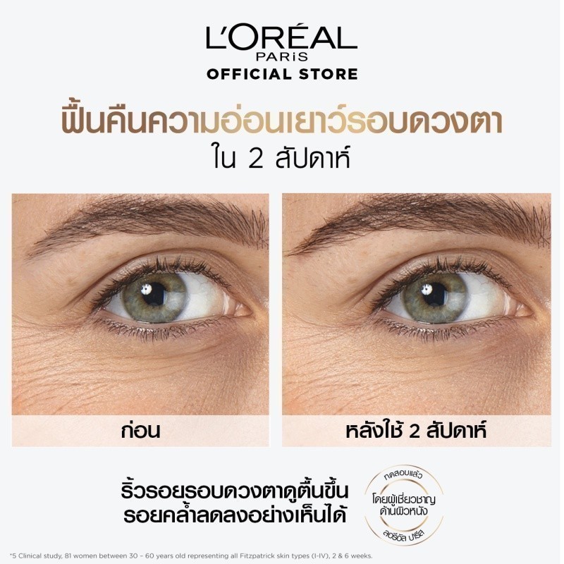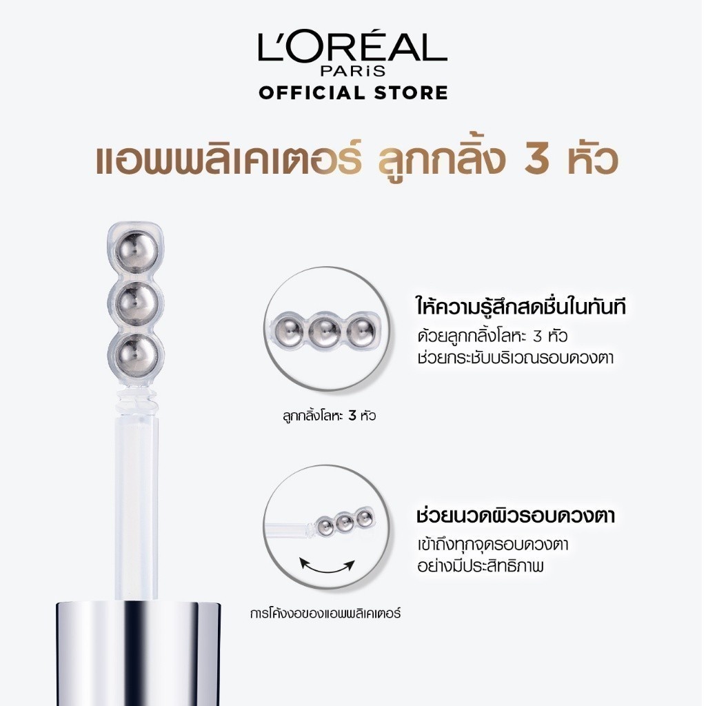 ... น 2 ส่วนผสม ทั้ง ไฮยาลูรอน และคาเฟอีน ครั้งแรกของ ไฮยาลูรอน เซรั่ม เพื่อดวงตาของคุณ 1.5% ไฮยาลูรอนิค แอซิด + 1% คาเฟอีน ไมโคร + แมคโคร ไฮยาลูรอน แอซิด เข้มข้น เติมความชุ่มชื้น ให้ผิวรอบดวงตาเรียบเนียน อิ่มเด้ง ลดเลือนริ้วรอยรอบดวงตา คาเฟอีนเป็นที่รู้จักดีในการต้านอนุมูลอิสระ ซึ่งช่วยปลุกพลังให้ผิวรอบดวงตาและช่วยเรื่องความหย่อยคล้อยรอบดวงตา ใหม่! Triple Roller Applicator ช่วยนวดบริเวณรอบดวงตา + ให้ความรู้สึกเย็นสดชื่นในทันที ติมพลังและฟื้นคืนความสดใสให้รอบดวงตา • เหตุผลที่คุณจะหลงรัก / WHY YOU WILL LOVE ITช่วยเติมความชุ่มชื้น ผิวอิ่มเด้ง ริ้วรอยดูลดเลือน • ผลลัพธ์ที่รู้สึกได้ / RESULTSทันทีที่ใช้: ผิวรู้สึกชุ่มชื้น ดวงตาดูสดใสขึ้น หลังใช้2สัปดาห์: ผิวบริเวณรอบดวงตาดูอ่อนเยาว์ลง 5 ปี เมื่อใช้อย่างต่อเนื่อง ซ ริ้วรอยใต้ตาลดลง 21.9%* *ผลการทดสอบทางคลีนิกในอาสาสมัครหญิงจำนวน 81คน 6สัปดาห์ • วิธีใช้ / HOW TO1. เริ่มต้นโดยการเตรียมผิวให้สะอาด 2. นวดวนเป็นวงกลมเล็กๆ ใต้ตาขมับ 4 ครั้ง 3. จากนั้นทาบนเปลือกตา 4. ใช้นิ้วกดเบาๆ ให้เซรั่มซึบซาบได้อย่างล้ำลึก • แบรนด์ของเรา / ABOUT OUR BRANDในฐานะแบรนด์ผลิตภัณฑ์ความงามอันดับต้น ที่มีวางจำหน่ายในร้านค้าชั้นนำทั่วไป ลอรีอัล ปารีส ได้สร้างสรรค์ผลิตภัณฑ์ที่ผสานนวัตกรรมที่สามารถเข้าถึงทุกคน ซึ่งทูตความงามของลอรีอัล ปารีส คือตัวแทนความงามในอุดมคติ ที่รวมไว้ในสโลแกนอันเป็นตำนาน: “คุณค่าที่เราคู่ควร”As the top beauty Brand sold in retail outlets, L’Oréal Paris makes the most innovative products accessible to everyone. Its ambassadors embody a certain beauty ideal summed up in the legendary signature: “Because you’re worth it.”