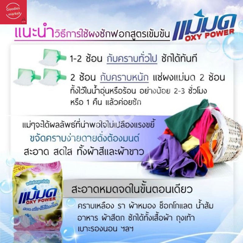 🔴NEW สินค้าผลิตใหม่ ผงซักฟอกแม่มด oxy power ปริมาณถุงละ 450 กรัม ออกฤทธิ์ดีในน้ำอุ่น ผลิตภัณฑ์ทำความสะอาด ผงซักผ้าสูตรเข้มข้น ซักได้ไม่เปลืองแรงขยี้ ถูกใจคุณแม่บ้าน ✔ขจัดคราบเปื้อน ชา กาแฟ ซอส ช็อกโกแล็ต ✔หมดห่วงว่าลูกจะเล่นเลอะมากแค่ใหน ✔แช่นานได้ ไม่เหม็นอับ วิธีใช้ได้ผลชัดเจน