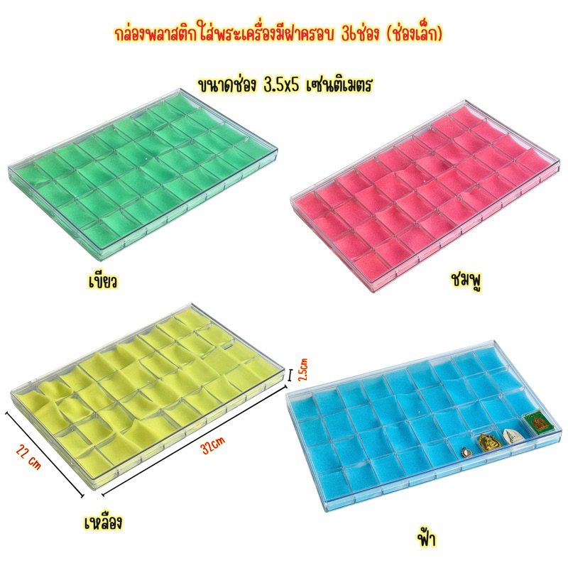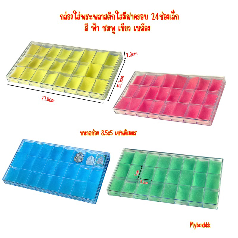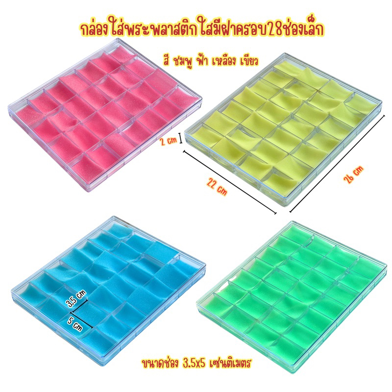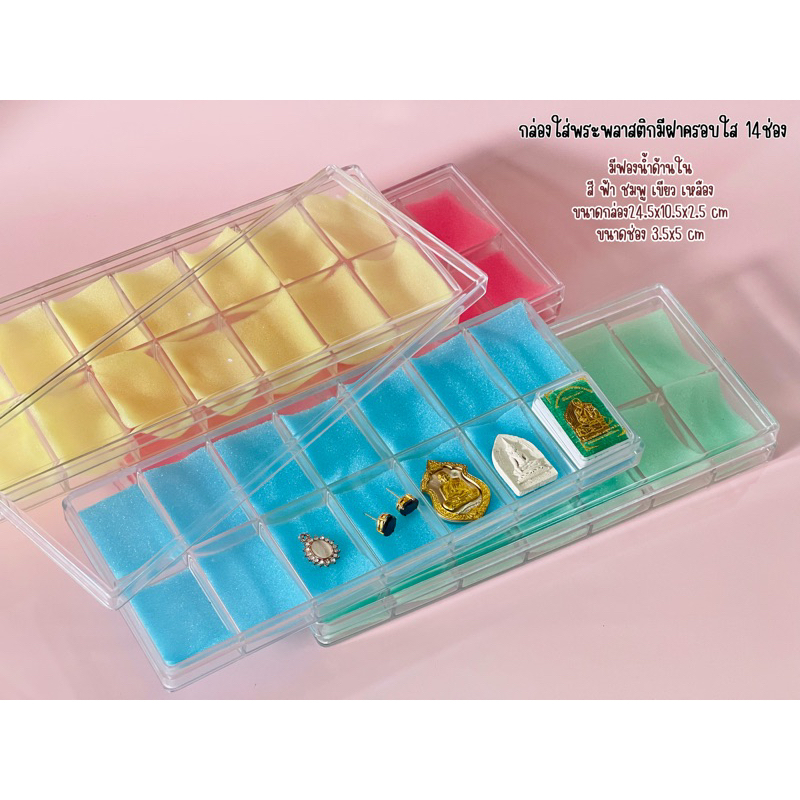 กล่องใส่พระกล่องพลาสติกกล่องใส่เครื่องประดับกล่องพระเครื่องกล่องพลาสติกมีฟองน้ำด้านใน 14/24/28/36/50ช่องเล็กคละสี จำนวน1ชิ้น แต่งภาพไห้เห็นสีครบทุกสีของฟองน้ำ ขนาด 14 ช่อง ขนาด24ช่อง ขนาด28ช่อง ขนาด 36ช่อง ขนาด50 ช่อง ขนาดช่อง 3.5x5เซนติเมตร ฟองน้ำด้านในแยกออกได้มีสี ชมพู เขียว ฟ้า เหลือง ก