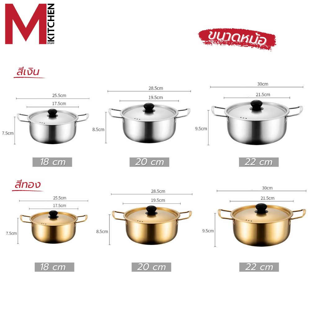 M KITCHEN หม้อ หม้อเกาหลี หม้อรามยอน หม้อสองหู พร้อมฝา หม้อทองเหลือง หม้อสแตนเลส หม้อมาม่า สามารถใช้ได้ทุกเตา ตัวเลือก 1.ขนาด 18 cm สูง 7.5 ความจุ 1500ml สีเงิน/ทอง 2.ขนาด 20 cm สูง 8.5 ความจุ 2200ml สีเงิน/ทอง 3.ขนาด 22 cm สูง 9.5 ความจุ 3000ml สีเงิน/ทอง - ผลิตจากสแตนเลส ไม่เป็นสนิม ทนทาน