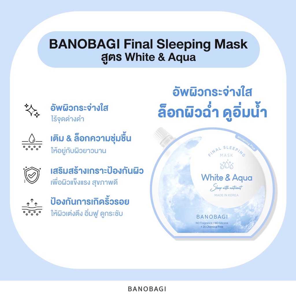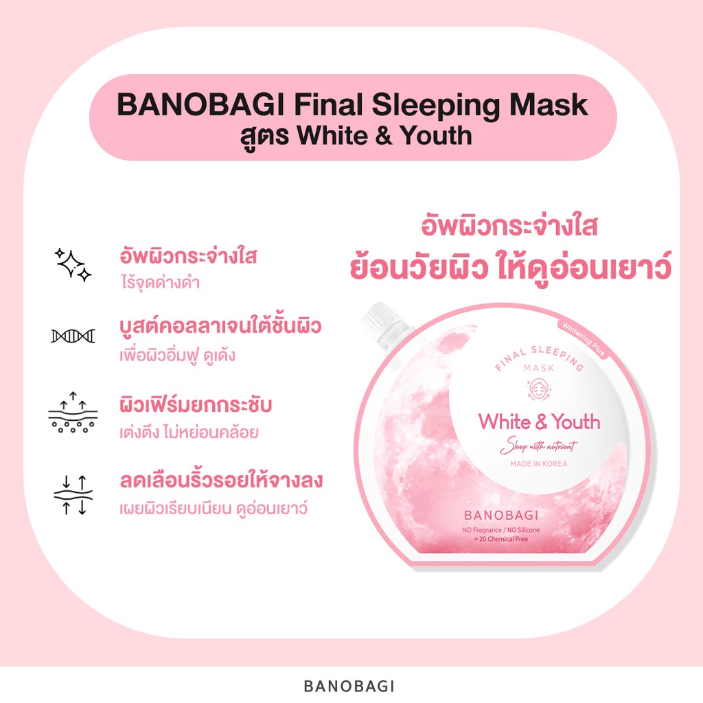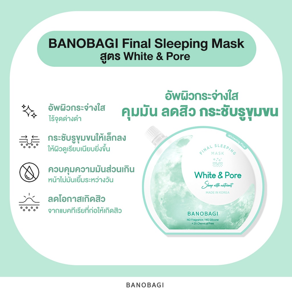 ... ไม่ให้สลายตัวเร็ว (ก่อนซึมลงสู่ผิว) ✅ ปราศจากสารระคายเคือง 20 ชนิด + ไม่มีน้ำหอม ผิวแพ้ง่ายใช้ได้ คนท้องใช้ได้ ● BANOBAGI Final Sleeping Mask - White & Pore "อัพผิวกระจ่างใส + คุมมัน ลดสิว กระชับรูขุมขน" ด้วย 4 พลังสารสกัดจากธรรมชาติ (Dragon Blood, Tea Tree, Salicylic, Witch Hazel) อัพผิวขาวกระจ่างใส คุมมัน กระชับรูขุมขนให้ดูเล็กลง ช่วยลดสาเหตุการเกิดสิว เพิ่มสมดุลผิวให้แข็งแรง เผยผิวใหม่เรียบเนียนขึ้น (เลขที่จดแจ้ง : 10-2-6500014961) ● BANOBAGI Final Sleeping Mask - White & Glow "อัพผิวกระจ่างใส + โกลว์กลาสสกิน แบบเกาหลี" ด้วย Master White Complex (โปรวิตามิน VC-IP & Vit C และทรานซามิค) ช่วยลดเลือนจุดด่างดำสะสมให้ดูจางลง ผิวที่เคยหมองคล้ำก็จะดูขาวกระจ่างใสขึ้น เผยผิวโกลว์ฉ่ำวาวแบบเกาหลี (เลขที่จดแจ้ง : 10-2-6500014963) ● BANOBAGI Final Sleeping Mask - White & Aqua "อัพผิวกระจ่างใส + ล็อกผิวฉ่ำฟู ดูอิ่มน้ำ" เสริมผิวให้แข็งแรง ช่วยเติมและกักเก็บความชุ่มชื้นในชั้นผิวได้ยาวนานยิ่งขึ้น เก็บล็อคผิวฟูดูอิ่มน้ำ ได้ตลอดวัน ลดปัญหาผิวแห้งกร้านขาดน้ำ พร้อมชะลอริ้วรอยก่อนวัย (เลขที่จดแจ้ง : 10-2-6500014958) ● BANOBAGI Final Sleeping Mask - White & Youth "อัพผิวกระจ่างใส + ย้อนวัยผิว ให้ดูอ่อนเยาว์" ผสานการบำรุงเข้มข้นด้วย Ectoin & Snow Mushroom ที่จะช่วยเสริมเส้นใยคอลลาเจนใต้ผิว ให้สัมผัสผิวเรียบเนียน กระชับ เด้งฟู (เลขที่จดแจ้ง : 10-2-6500014753) วิธีใช้ : ใช้เป็นขั้นตอนสุดท้ายของการบำรุงผิวก่อนนอนทุกวัน เพื่อล็อคทุกการบำรุงให้อยู่กับคุณตลอดคืน…ถึงเช้า ใช้ในปริมาณ 2 ข้อนิ้ว จำนวน 3 นิ้ว ทาทั่วใบหน้าและลำคอ(1 ซอง ใช้ได้ 3 ครั้ง)