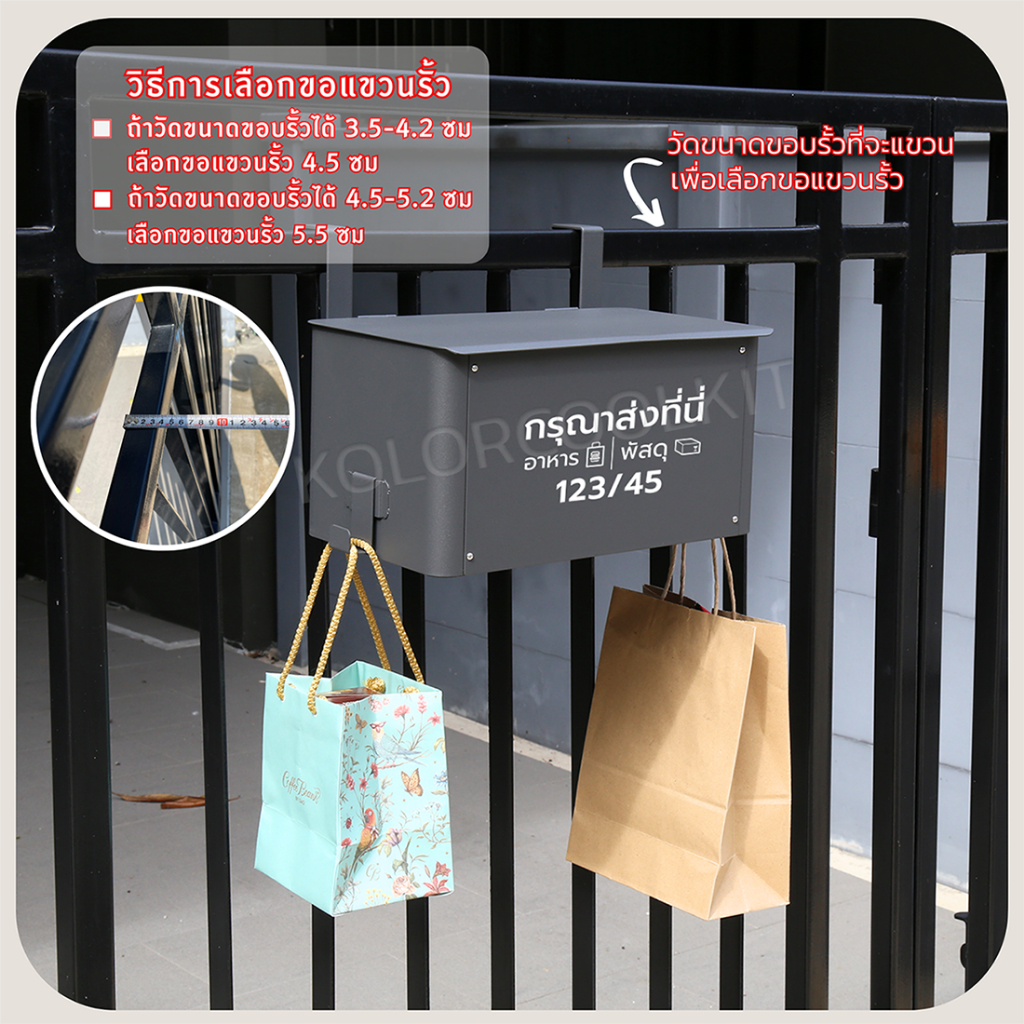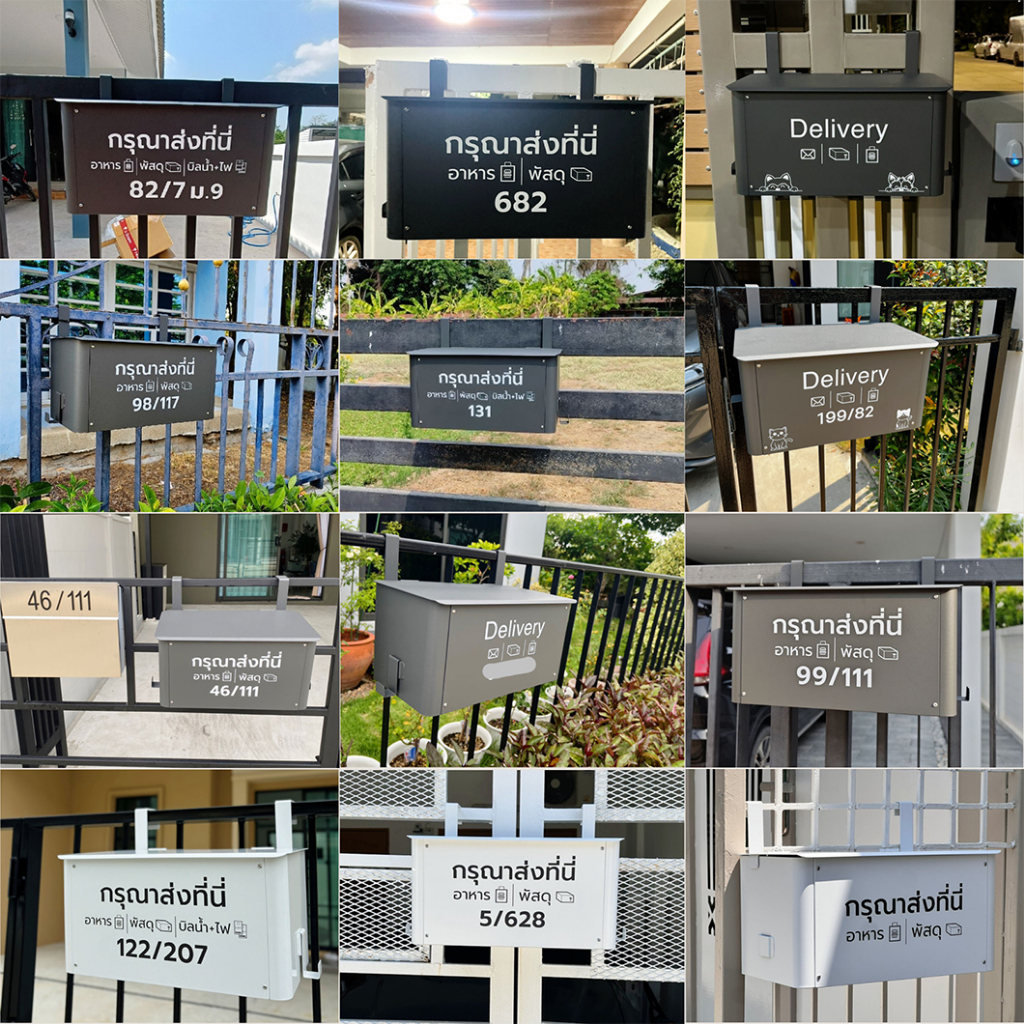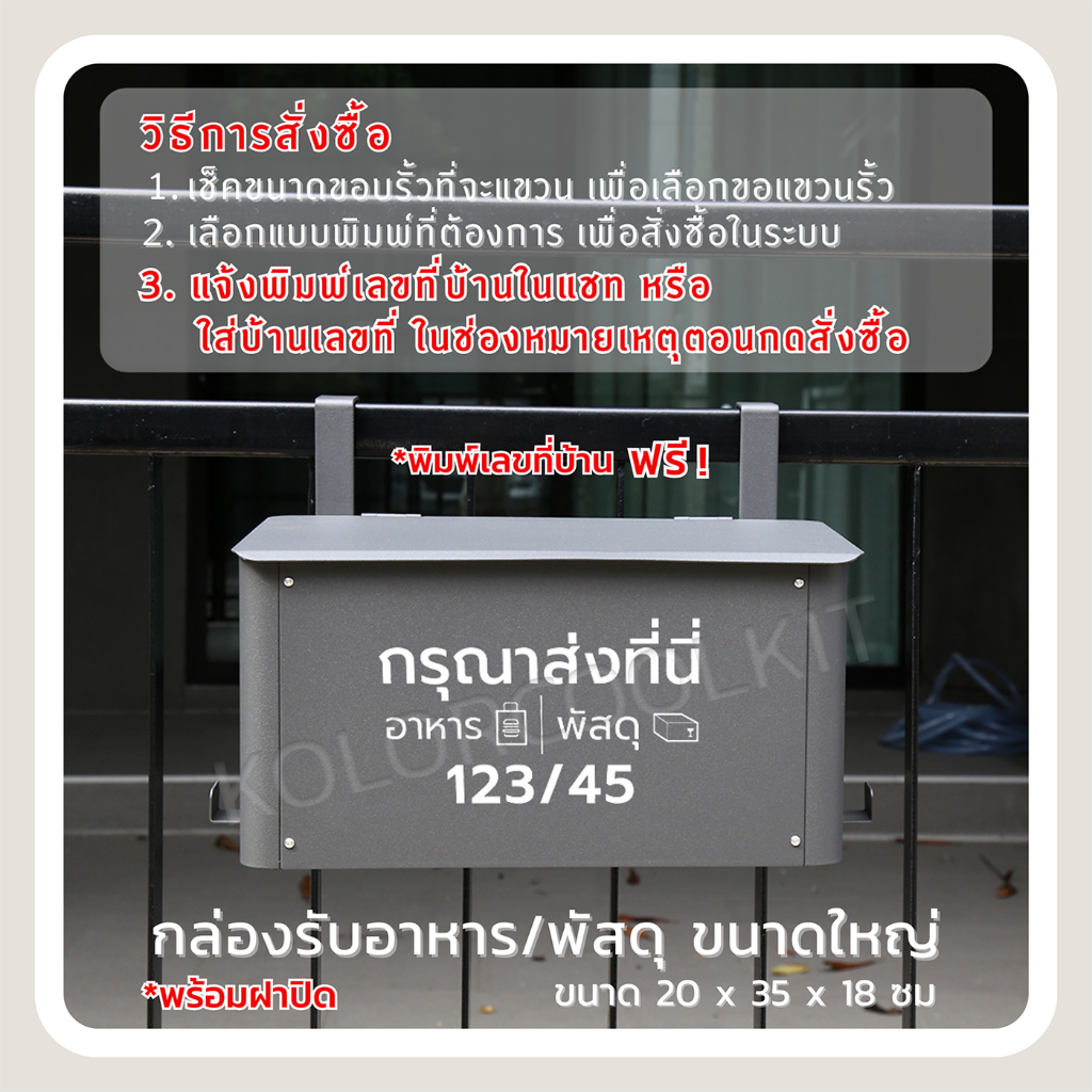 ... -ปิดง่าย เพื่อป้องกันน้ำฝน และฝุ่นละออง - เคลือบสีฝุ่นแบบภายนอก (Outdoor) อบสีที่อุณหภูมิ 250 องศาเซลเซียส เพื่อความคงทนต่อแดดและฝน - ด้านในออกแบบพิเศษ ให้มีรูระบายน้ำด้านล่าง ไม่ต้องกลัวน้ำขัง - ประกอบติดตั้งง่ายด้วยตัวเอง มีคู่มือการประกอบ พร้อมอุปกรณ์และประแจครบในเซ็ท - ขอแขวนรั้ว เหล็กหนา 3 มม มั่นคงแข็งแรง มีหลายขนาดให้เลือกตามขนาดของรั้วบ้าน - แป้นรับขอแขวน ซ้าย/ขวา + ขอแขวนข้าง 2 ชิ้น เหล็กหนา 1.2 มม สำหรับแขวนถุงอาหาร มั่นคง แข็งแรง แถมพร้อมในเซ็ท - ใช้สกรูสเตนเลส พร้อมหัวน๊อตล๊อกกันคลายทุกตัว เพื่อป้องกันสนิมและการใช้งานที่ยาวนาน - มีแบบให้เลือกพิมพ์หลายแบบ ตามความชอบ - ลวดลายและตัวหนังสือพิมพ์ด้วยระบบ UV (Ultraviolet) เครื่องพิมพ์นำเข้าจากญี่ปุ่น สีคมชัด สวยงาม ติดแน่น ทนนาน *** มั่นใจได้ในคุณภาพ จากโรงงานผู้ออกแบบและผลิตสินค้าตกแต่งบ้าน มายาวนานกว่า 30 ปี " เราเป็นผู้นำในการผลิต กล่องรับอาหาร/พัสดุ รายแรกก่อนใคร ! "