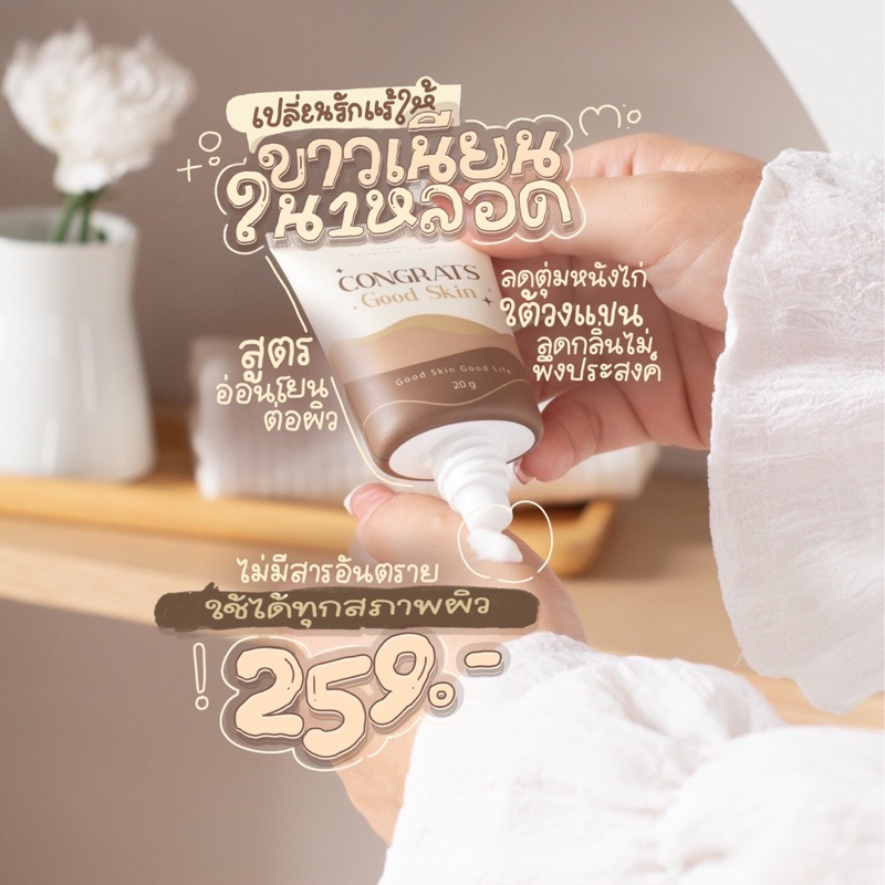 ... ่างต่อเนื่องจะเห็นความเปลี่ยนแปลงแน่นอนค่ะ 🍃 ขนาด : 20 กรัม ราคา 259 บาท ระยะเวลาในการใช้ : 1-2 เดือน วิธีใช้ : เช้า หรือ เย็น จุดที่ต้องการเฉพาะ เช่น รักแร้ คอ ขาหนีบ ตาตุ่ม ข้อศอก รอยแตก เป็นต้น ทาบางๆบริเวณที่ต้องการหลังอาบน้ำ แนะนำให้ทาบางๆก็พอค่ะ 📍โกนขน แว๊กซ์ แนะนำงดใช้ครีม 1-2 วัน 📍