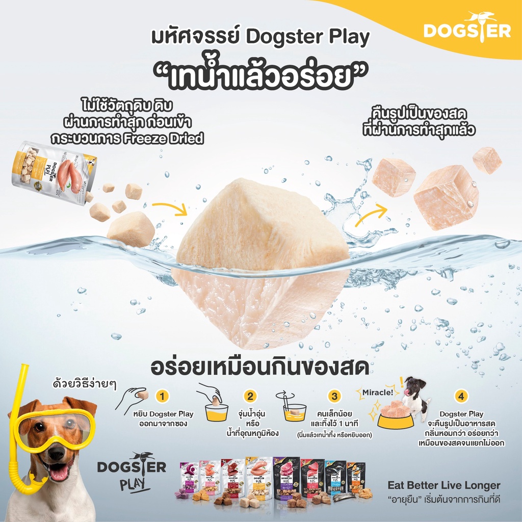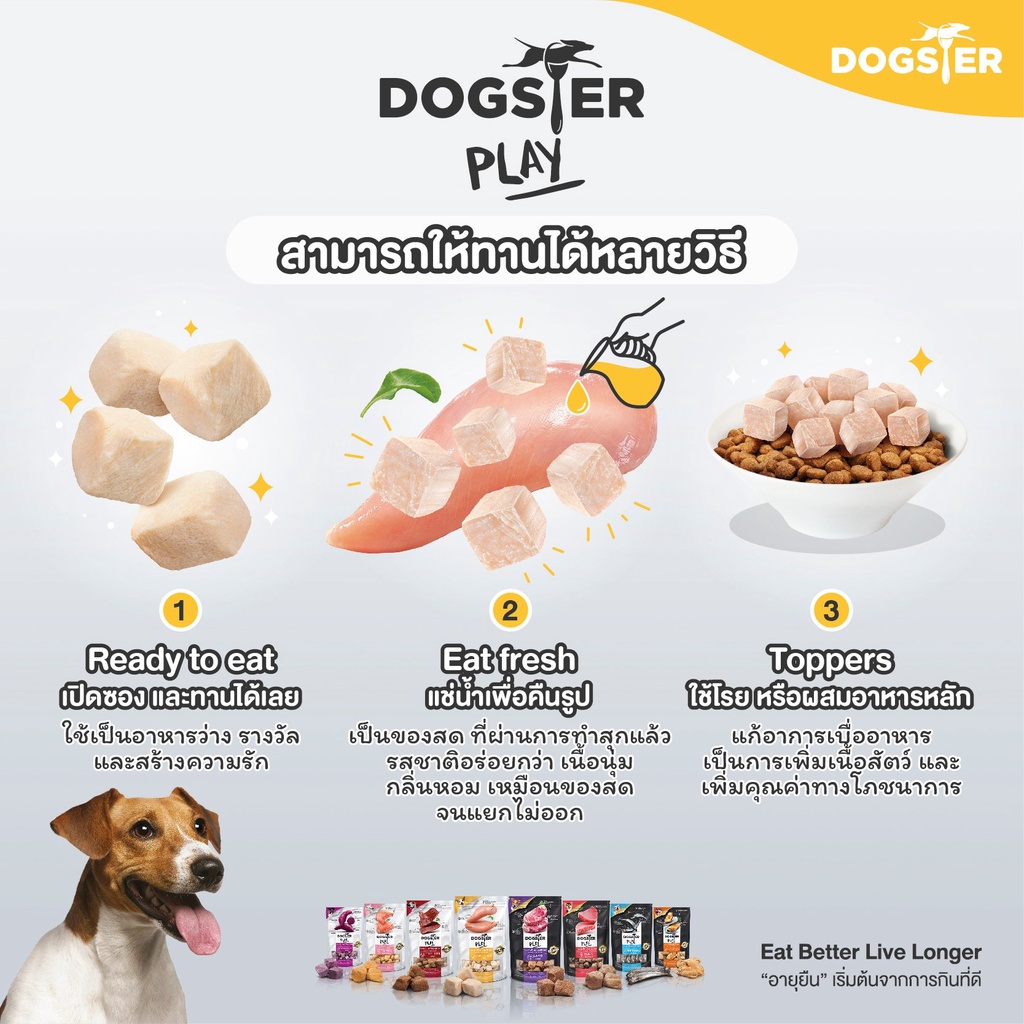 Dogster Play ขนมสุนัข Freeze Dried ท็อปปิ้งฟรีซดรายสำหรับน้องหมา ชิ้นเนื้อแท้ ไม่ใส่เกลือวัตถุกันเสีย สี กลิ่นสังเคราะห์
