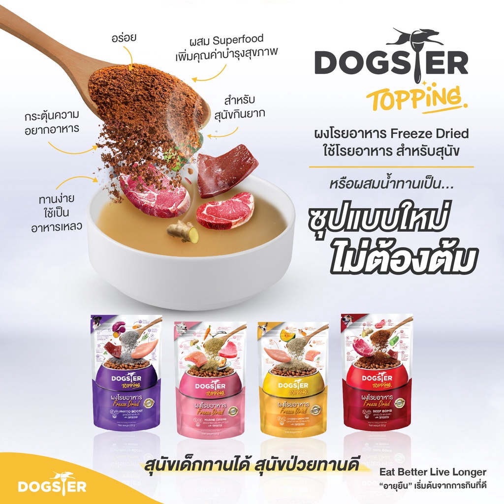... เพื่อคืนกลับเป็นอาหารสดได้ • ผ่านการวิจัยและพัฒนาโดยอาจารย์หมอสัตวแพทย์และผู้เชี่ยวชาญด้านโภชนาการศาสตร์อาหารสัตว์ • ไม่ใช้วัตถุกันเสีย, สี, กลิ่นสังเคราะห์, เกลือและวัตถุปรุงแต่ง • ทานได้ทุกโอกาส ของว่าง, ของรางวัล, ท๊อปปิ้ง, เพิ่มคุณค่าและกระตุ้นความอยากอาหาร มีทั้งหมด 11 รสชาติ 1. เนื้อไก่ 2. เนื้อปลาแซลมอน 3. ตับวัว 4. มันม่วง 5. เนื้อแกะ 6. ปลาไข่ทั้งตัว 7. ปลาทูน่า 8. เนื้อไก่+มันหวาน 9. เนื้อปลาแซลมอนและฟักทอง 10. เนื้อปลาทูน่าและแครอท 11. เนื้อแกะและแตงกวา ใหม่!! Dogster Topping ขนาด 50 กรัม เพิ่มประสบการณ์ใหม่ ให้อาหารมื้อเดิม และอาหารมื้อเดิมจะไม่เหมือนเดิมอีกต่อไป สามารถโรยลงบนอาหารได้ทุกประเภท ไม่ว่าจะเป็น อาหารเม็ด อาหารเปียก อาหารสด หรือจะเทน้ำเพื่อคืนรูปให้เป็นน้ำเกรวี่ หอม อร่อยขึ้น x 2 - ใช้โรยบนอาหารหลักเพื่อ เพิ่มความอร่อยสำหรับน้องกินยาก - ใช้เพื่อเพิ่มคุณค่าทางโภชนาการ และเพิ่มเนื้อสัตว์ให้อาหารเม็ด - High nutrition คุณค่าทางอาหารสูงสุด ด้วยนวัตกรรม Freeze Dried - No Food additives ปราศจากสารปรุงรส สารกันเสีย และไม่เค็ม - Add water for better taste เทน้ำเพื่อคืนรูปได้ - ผสม Superfood ช่วยบำรุงสุขภาพ - Lightly cooked ผ่านการทำให้สุก ปราศจากเชื้อโรค (ไม่ใช้วัตถุดิบ ดิบ) - Human-Grade whole food ingredients ผลิตจากวัตถุดิบธรรมชาติเกรดอาหารคน มี 4 รสชาติ Chicken Chowder เนื้อไก่และปลาแซลมอน โปรตีนสูง บำรุงกล้ามเนื้อ Marine Cuisine ปลาแซลมอนและปลาทูน่า คุณค่าสารอาหารสูงจากท้องทะเล Beef Bomb ตับวัวและเนื้อแกะ หอมกลิ่นเนื้อ ช่วยให้เจริญอาหาร Phyto Boost เนื้อไก่และตับวัว ไฟโตนิวเทรียนท์ เสริมสร้างภูมิคุ้มกัน