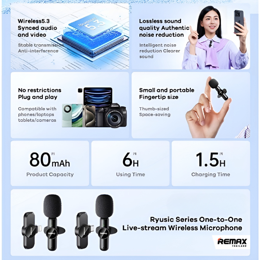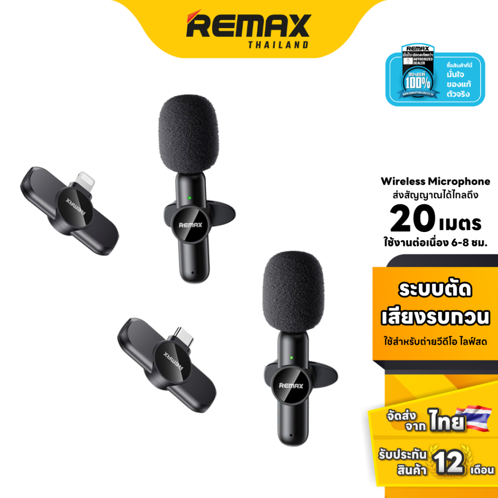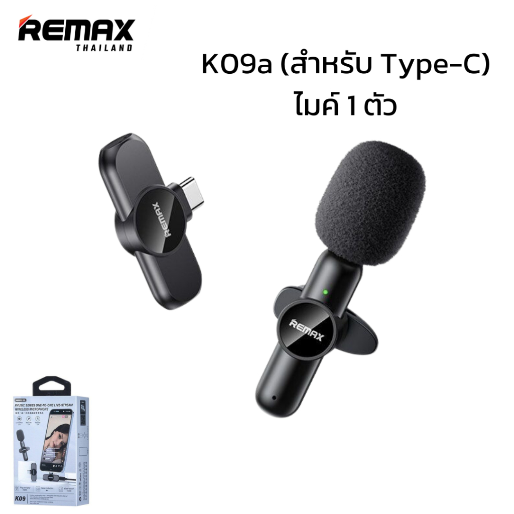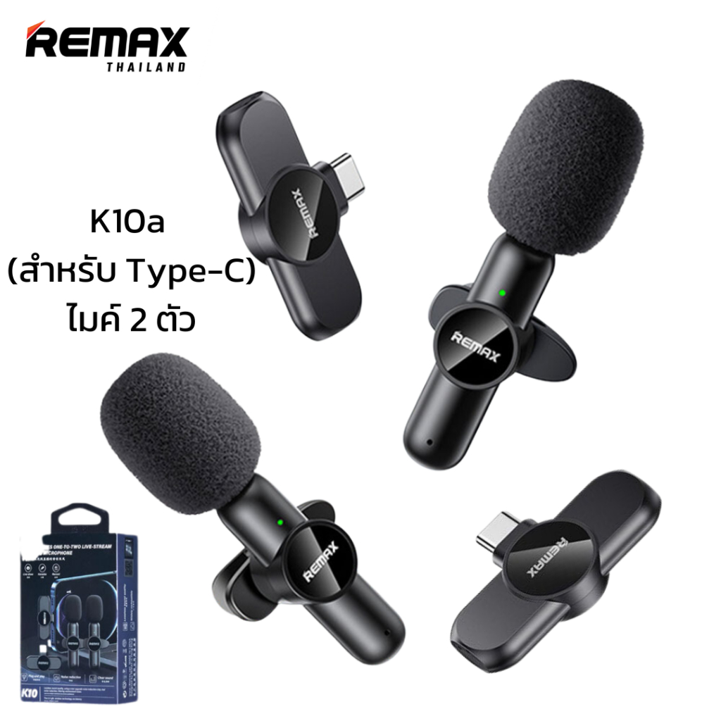 ... บสัญญานหัวต่อสมาร์ทโฟน -มาพร้อมกับไมโครโฟนไร้สาย 1 ตัว สามารถทำงานได้พร้อมกัน -ตัวส่งสัญญาณเป็นไมค์แบบ Build-in ในตัว สามารถใช้งานแบบหนีบปกเสื้อ หรือถือสัมภาษณ์ -ส่งสัญญาณได้ไกลถึง 20 เมตร(ไม่มีสิ่งกีดขวาง) -มีระบบตัดเสียงรบกวนอัตโนมัติ -ใช้สำหรับถ่ายวีดีโอ ไลฟ์สด -มีแบตเตอรี่ในตัวขนาด 80 mAh พร้อมช่องชาร์จแบบ Type-c (ไมโครโฟน) ตัวรับสัญญาณมีช่องชาร์จแบบที่เลือก -ใช้งานต่อเนื่อง 6-8 ชม. **ไม่รองรับสมาร์ทโฟนที่มีช่อง Type-C / ไลค์ และช่อง Aux3.5mm. อยู่ในเครื่องเดียวกัน** วิธีการใช้งาน -เสียบตัวรับสัญญาณเข้ากับโทรศัพท์ที่มีพอร์ตรองรับ -จากนั้นกดเปิดตัวไมโครโฟนที่ด้านหลังให้เป็นไฟสีเขียว -เมื่อตัวไมโครโฟน เชื่อมต่อกับตัวรับสัญญาณสำเร็จไฟสถานะจะเป็นสีเขียวค้าง แล้วใช้งานได้เลย อุปกรณ์ในกล่อง -Stream and microphone K09 - Remax -สายชาร์จ -คู่มือการใช้งาน -------------------------------------------------------------------------------- รุ่น K10 ไมค์ 2 ตัว มี 2 ตัวเลือก -Type C (K10a) -ไลค์ (K10i) รายละเอียด Wireless Microphone จาก Remax รุ่น K10 ไมโครโฟนไร้สาย ไมโครโฟนแบบ wireless -หัวต่อสมาร์ทโฟน เป็นระบบไมโครโฟนไร้สาย 2.4GHz -ซึ่งมีการออกแบบที่ล้ำสมัยและใช้งานง่าย พร้อมไมโครโฟนในตัวเครื่องส่งสัญญาณ คุณสมบัติ -ตัวรับสัญญานหัวต่อสมาร์ทโฟน -มาพร้อมกับไมโครโฟนไร้สาย 2 ตัว สามารถทำงานได้พร้อมกัน -ตัวส่งสัญญาณเป็นไมค์แบบ Build-in ในตัว สามารถใช้งานแบบหนีบปกเสื้อ หรือถือสัมภาษณ์ -ส่งสัญญาณได้ไกลถึง 20 เมตร(ไม่มีสิ่งกีดขวาง) -มีระบบตัดเสียงรบกวนอัตโนมัติ -ใช้สำหรับถ่ายวีดีโอ ไลฟ์สด -มีแบตเตอรี่ในตัวขนาด 80 mAh พร้อมช่องชาร์จ (ไมโครโฟน และตัวรับสัญญาณ) -ใช้งานต่อเนื่อง 6-8 ชม. **ไม่รองรับสมาร์ทโฟนที่มีช่อง Type-C /ไลค์ และช่อง Aux3.5mm. อยู่ในเครื่องเดียวกัน** วิธีการใช้งาน -เสียบตัวรับสัญญาณเข้ากับโทรศัพท์ที่มีพอร์ตรองรับ -จากนั้นกดเปิดตัวไมโครโฟนที่ด้านหลังให้เป็นไฟสีเขียว -เมื่อตัวไมโครโฟน เชื่อมต่อกับตัวรับสัญญาณสำเร็จไฟสถานะจะเป็นสีเขียวค้าง แล้วใช้งานได้เลย อุปกรณ์ในกล่อง -Stream and microphone K10 - Remax -สายชาร์จ -คู่มือการใช้งาน