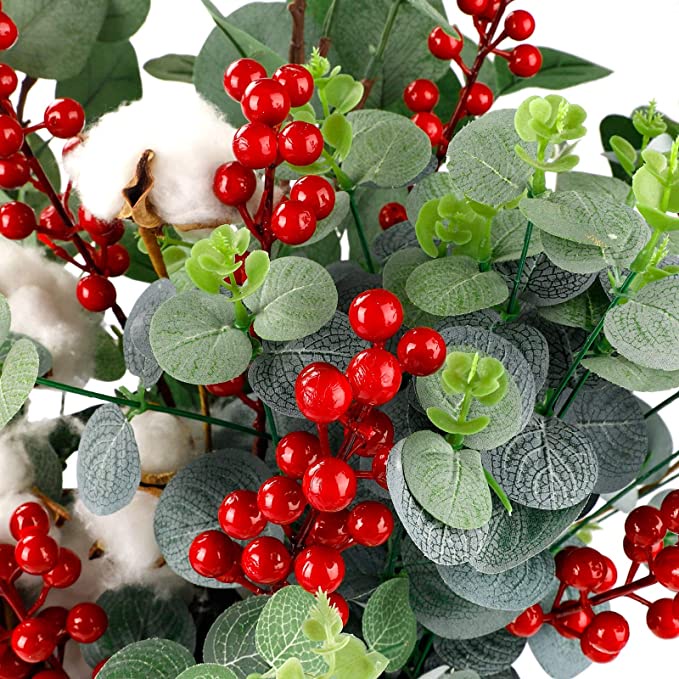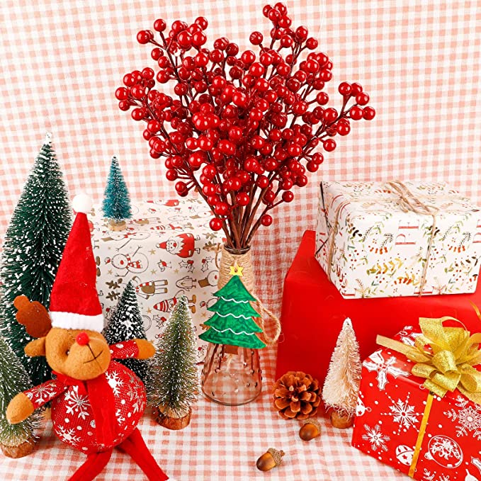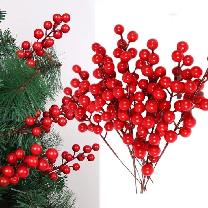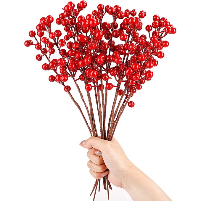 เครื่องประดับเบอร์รี่สีแดงเทียมของผลไม้แห่งโชคลาภ ก้านเบอร์รี่ทำจากลวดเหล็กและโฟม พื้นผิวของผลเบอร์รี่ถูกเคลือบด้วยสารกันน้ำเนื้อนุ่มซึ่งกันน้ำได้เป็นเวลา 3 เดือน กิ่งก้านประดิษฐ์ที่มีลำต้นเบอร์รี่สีแดงเป็นงานรื่นเริงมากและเหมาะสำหรับพวงหรีดอีสเตอร์ DIY ประดับต้นไม้เถาวัลย์และการจัดดอกไม้ คุณยังสา