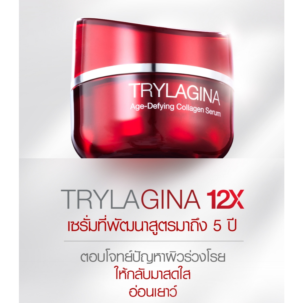 The Sense of Youth Infinity รู้สึกถึงความอ่อนเยาว์ไม่มีที่สิ้นสุด TRYLAGINA Age-Defying Collagen Serum 12X การพัฒนาที่ไม่สิ้นสุด สู่ผลิตภัณฑ์ที่ยอดเยี่ยม เพื่อให้คุณได้สัมผัสความอ่อนเยาว์ ตามแบบฉบับของ ไตรลาจีน่า เซรั่มสูตรใหม่ ดีขึ้น 12 เท่า *เมื่อเทียบเท่ากับการใช้ Trylagina Intensive Collagen