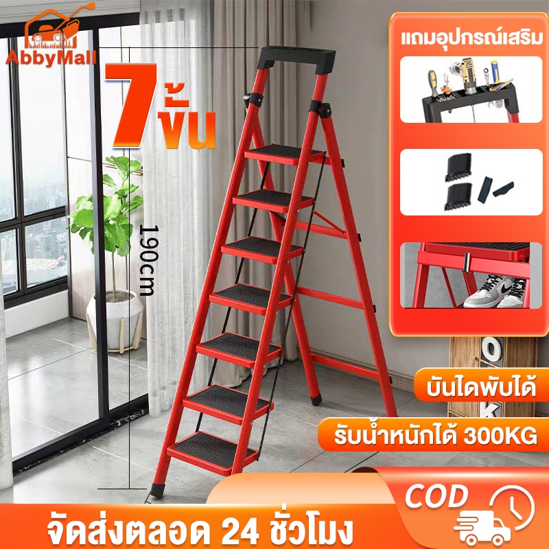 ABBY บันได บันไดพับได้ 7ขั้น 190cm รับน้ำหนักได้ 300KG วัสดุเหล็กอลูมิเนียมอย่างหนา พับเก็บได้ กันลื่น ชั้นวางเครื่องมือ