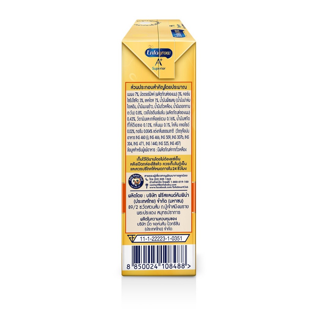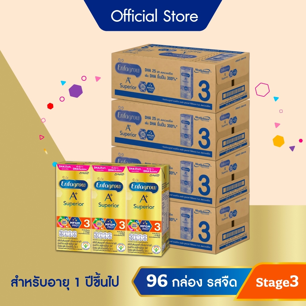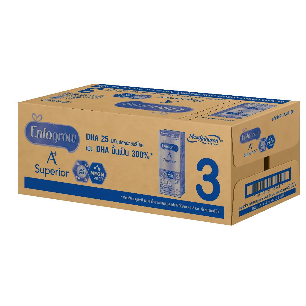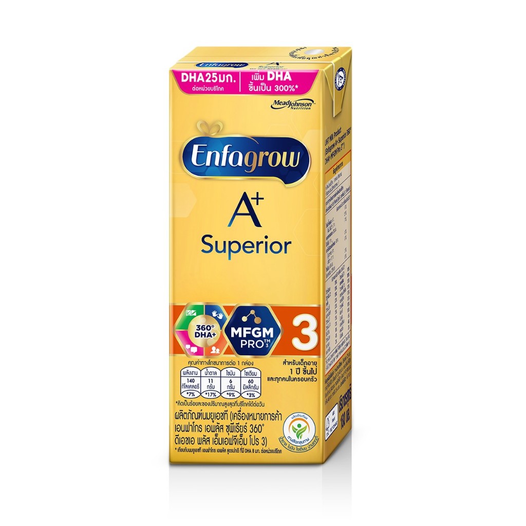 นมกล่อง เอนฟาโกร 3 ยูเอชที ซุพีเรียร์ 180 มล. (24 กล่อง) x 4 ลัง ENFAGROW+ SUPERIOR 3 RTD PLN 180 ML (24 boxes) x 4 case • มี MFGM (MFGM หรือ Milk Fat Globule Membrane คือเยื่อหุ้มอนุภาคไขมันในนม ซึ่งมีองค์ประกอบหลักคือโปรตีนและไขมันหลายชนิดรวมกัน) • DHA มีดีเอชเอ 25 มก. ต่อหน่วย 1 บริโภค •