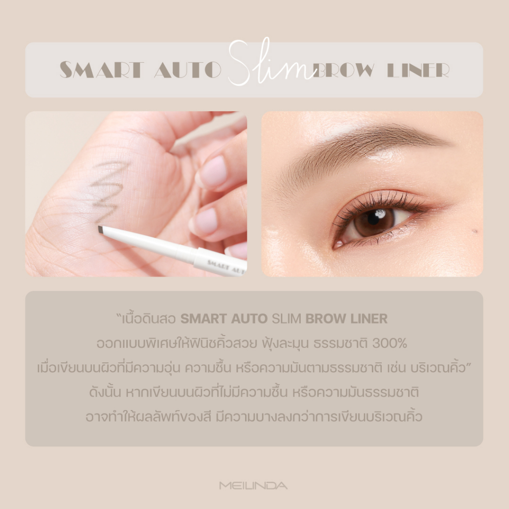 ... นใบหน้าที่เป็นตัวกำหนด total look ถ้าหากเขียนได้อย่างเป็นธรรมชาติจริงๆ ก็จะสามารถทำให้เมคอัพโดยรวมดูธรรมชาติละมุนขึ้นมาได้อีกหลายเท่า เมลินดาได้พัฒนา Smart auto slim brow liner ให้เข้ากับเทรนด์คิ้วในปัจจุบัน ให้ฟินิชคิ้วมีความเบลนด์ฟุ้ง ละมุน ไร้ขอบ โทนสีที่ใกล้เคียงโทนสีผิวของตัวเองที่สุด ลดความจัดจ้านและลดโครง ลดเหลี่ยมมุม เพื่อให้หน้าดูอ่อนโยนขึ้น แต่ยังคงคุณสมบัติที่ดีของดินสอเขียนคิ้ว ไม่ว่าจะเป็นความติดทน กันน้ำไว้เหมือนเดิม ** เนื้อดินสอ smart auto slim brow liner ออกแบบมาพิเศษเพื่อฟินิชคิ้วสวยฟุ้งละมุนธรรมชาติ 300% เมื่อเขียนลงบนผิวที่มีความอุ่น มีความชื้น หรือมีความมันตามธรรมชาติเช่น บริเวณคิ้ว ดังนั้นหากเขียนดินสอเขียนนคิ้ว smart auto slim brow liner โดยตรงบนผิวที่ไม่มีชื้อน หรือ ความมันตามธรรมชาติ อาจทำให้ผลลัพธ์ของสีที่ได้มีความบางลงกว่าการเขียนที่บริเวณคิ้ว** ปริมาณ 0.05 กรัม ❤️ อ่านรายละเอียดก่อนสั่งซื้อนะคะ❤️ ✨ ร้านค้า MEILINDA OFFICIAL (เมลินดา) เป็น Official Store จัดจำหน่ายสินค้าจากแบรนด์โดยตรง สินค้าทุกชิ้นส่งออกจากบริษัทเอง ✨ จัดส่งสินค้าทุกวันจันทร์ ถึง วันศุกร์ หยุดวันเสาร์วันอาทิตย์และวันหยุดนักขัตฤกษ์ ✨ ตัดรอบทุกวัน ก่อนเวลา 09.30 น. กรณีที่ชำระเงินหลังจากนี้ ทางร้านจัดส่งในวันทำการถัดไป สั่งสินค้าในวันศุกร์หลัง 9.30 จัดส่งในวันจันทร์ถัดไปนะคะ ✨ กรณีสินค้ามีปัญหา จัดส่งไม่ครบ จัดส่งผิดสี/ไม่ตรงตามออเดอร์ สามารถทักแชทแจ้งแอดมินได้ทันทีเลยค่ะ 💕 ✨ รบกวนคุณลูกค้าถ่ายคลิปวีดีโอ ขณะเปิดสินค้าไว้ทุกครั้งเพื่อผลประโยชน์ของคุณลูกค้าเองค่ะ 🙏🏻 ขอบพระคุณคุณลูกค้าทุกท่านที่ให้ความสนใจและสนับสนุน อุดหนุนสินค้าเมลินดานะคะ🙏🏻