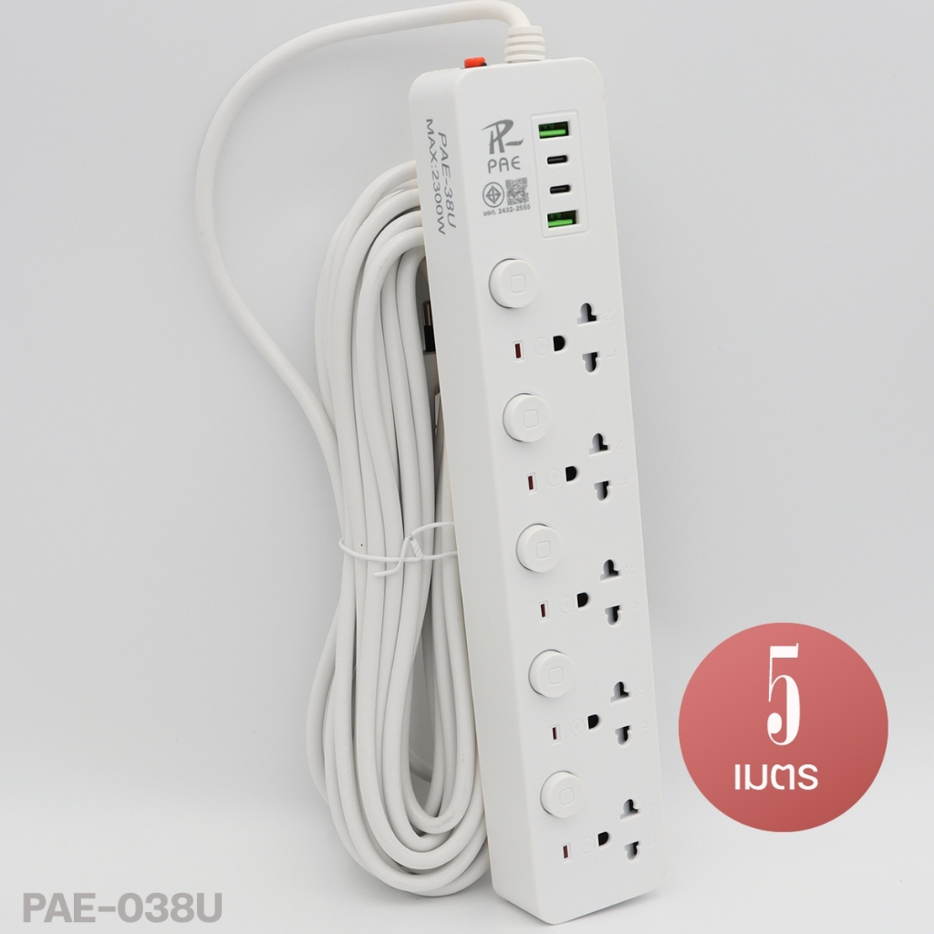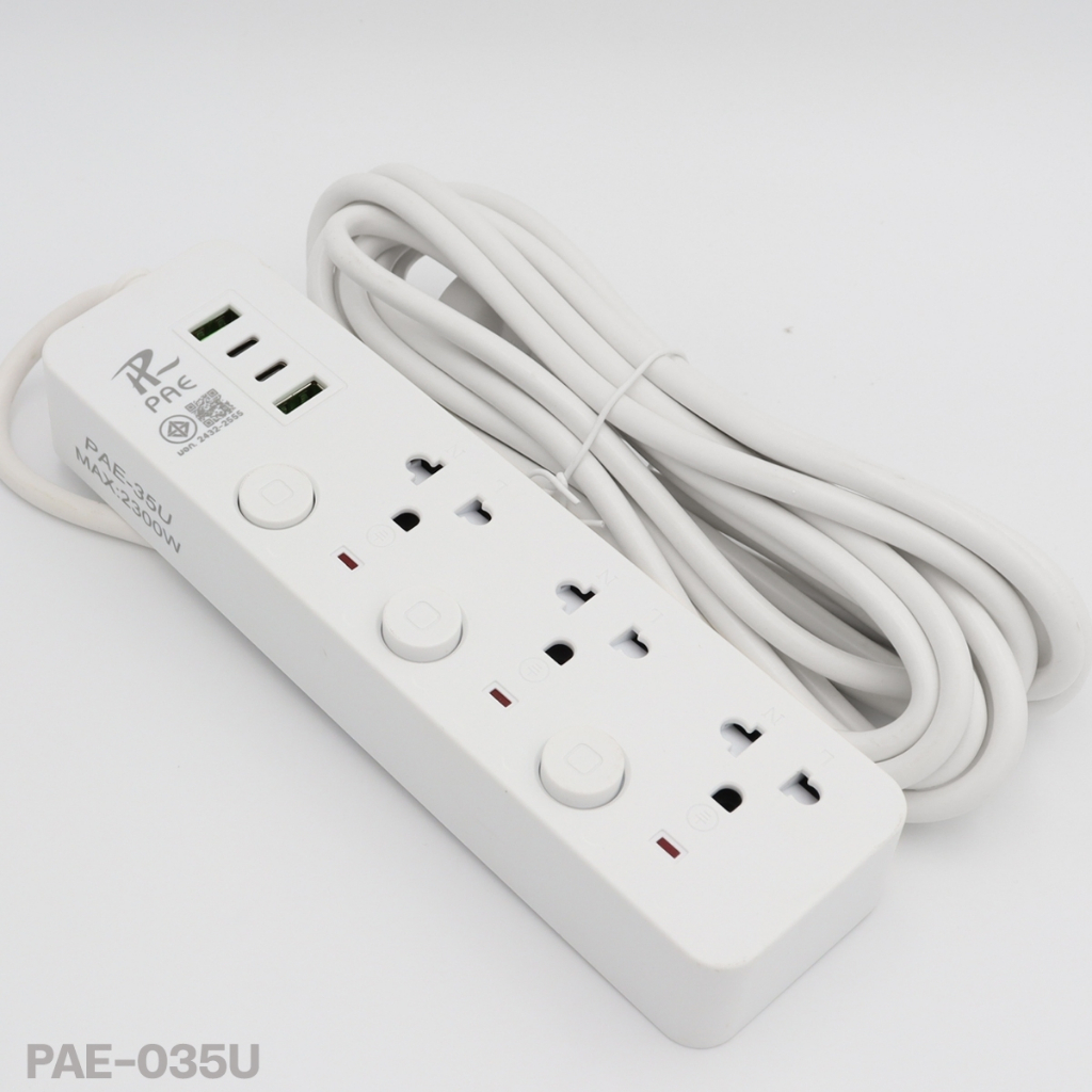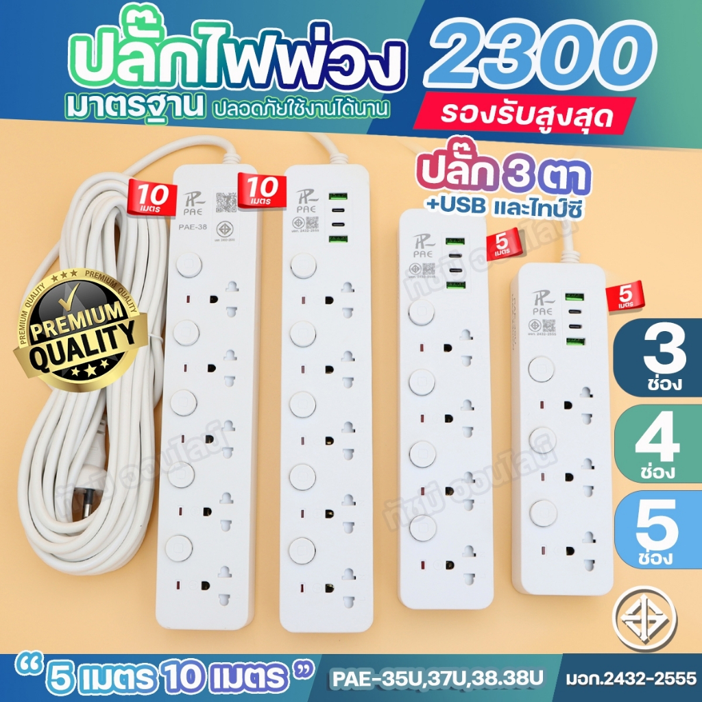 ปลั๊กไฟ รุ่น PAE-35U PAE-37U PAE-38U PAE-38 ความยาว 3เมตร 5เมตร 10เมตร ปลั๊กสายต่อพ่วง มีสวิตช์เปิดปิด ควมคุมช่อง ปลักไฟเอนกประสงค์มาตรฐาน มอก. มีม่านนิรภัยกันเด็กจิ้มเล่น มีระบบตัดไฟอัตโนมัติ ปลั๊ก 3 ตา ทั้งหมด 3-4-5ช่อง / (ช่องเสียบ 2USB 2ไทป์C) รองรับกำลังไฟสูงสุด 2300W มีสวิตช์ ปิด-เปิด ทุ