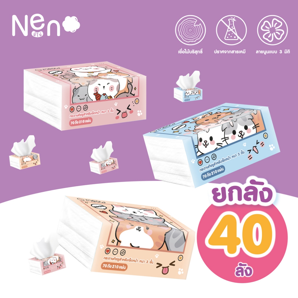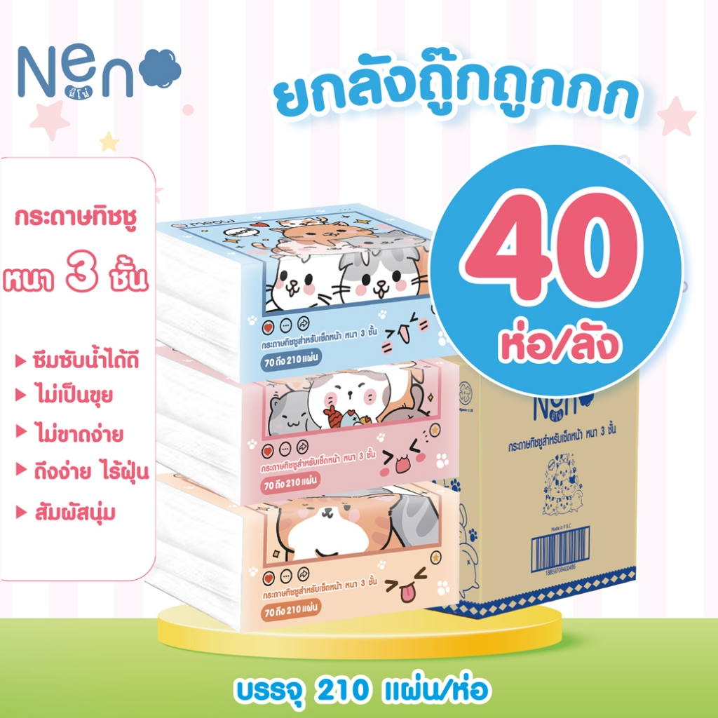 Neno แมว [ยกลัง 40ห่อ] กระดาษทิชชู่ หนา 3ชั้น 1ห่อมี 210 แผ่น ไม่เป็นขุย ไม่ขาดง่าย GB/T 20808