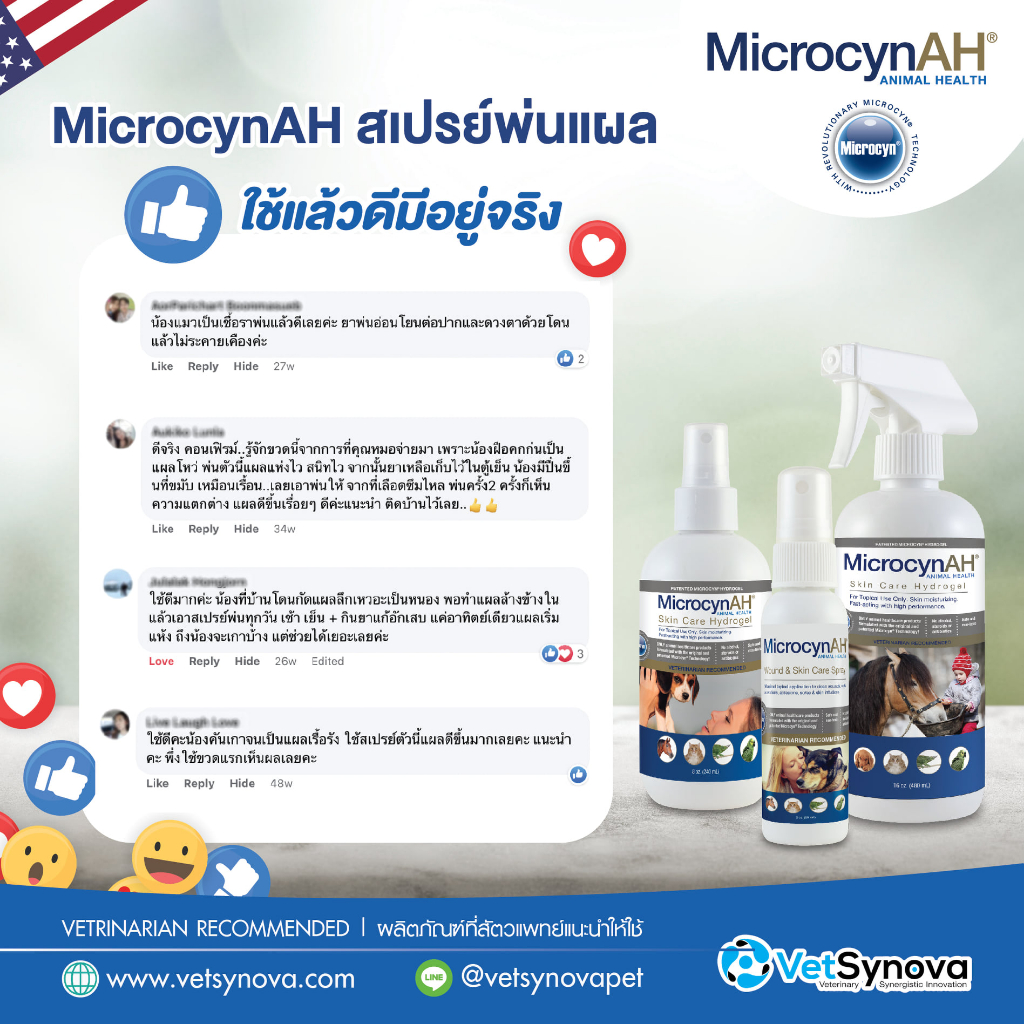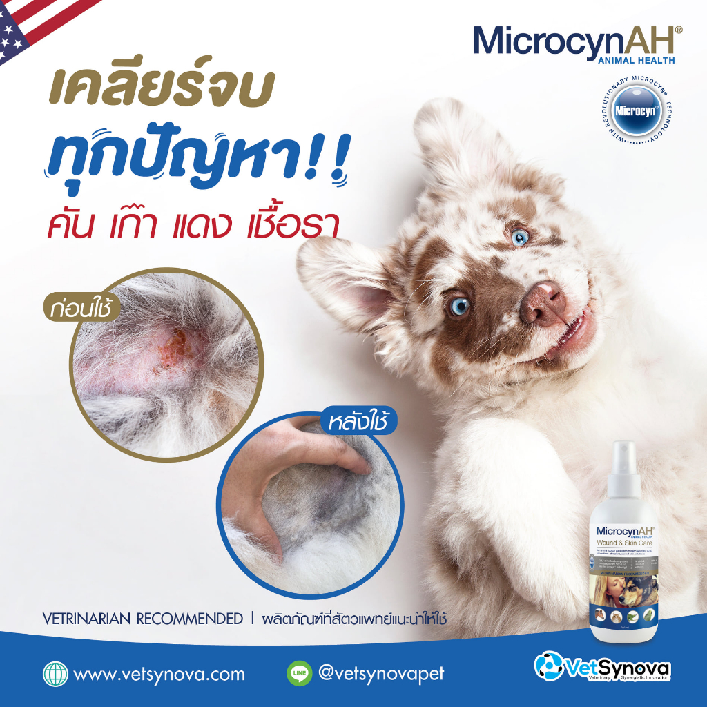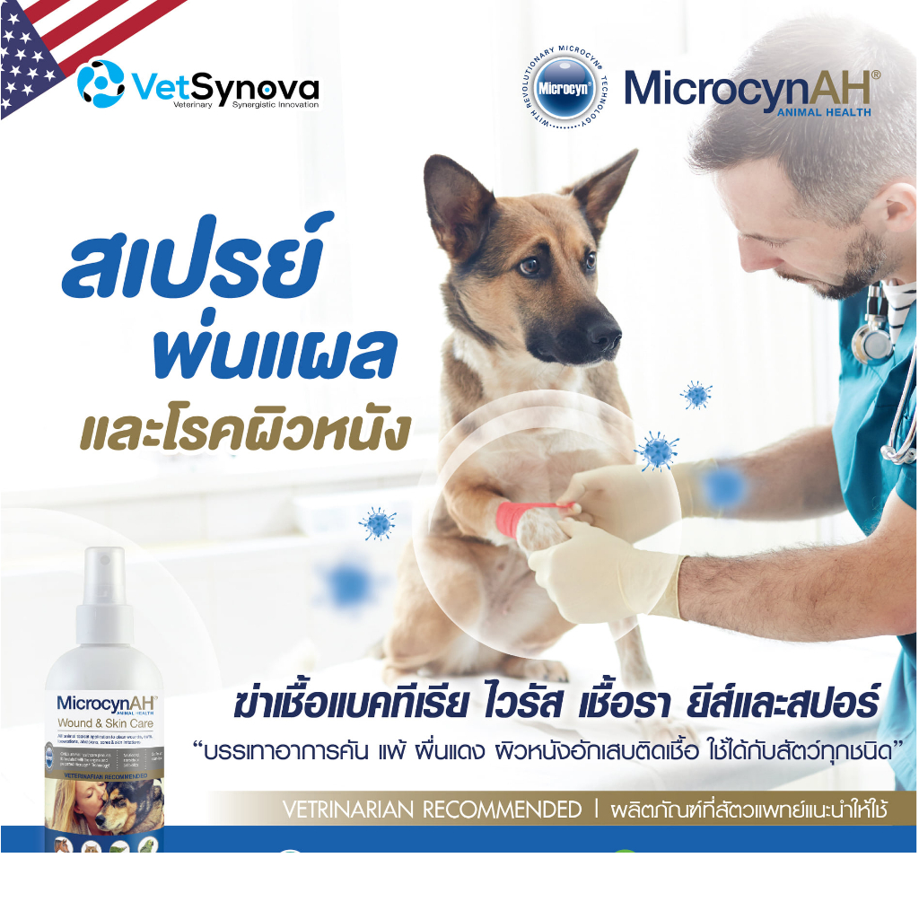 ... re Spray ขนาด 120ml Exp.30/11/2026 • สเปรย์พ่นแผลที่มาแรงที่สุดในขณะนี้ MicrocynAH Wound & Skin Care Spray • สเปรย์บำรุงผิวให้ความชุ่มชื้น ทำความสะอาดชะล้างและกำจัดเนื้อตาย ประกอบการรักษาแผล เช่น แผลหลังผ่าตัด แผลขอบเรียบ แผลถลอกแผลติดเชื้อเป็นหนอง แผลโดนกัด แผลหลุม ผิวหนังระคายเคือง แพ้แดง แผลเกา แผลไฟไหม้ แผลมีกลิ่น • ด้วยนวัตกรรมเทคโนโลยีสิทธิบัตรอันล้ำสมัยจาก Microcyn Technology ประเทศสหรัฐอเมริกา ส่วนประกอบหลัก คือ กรด Hypochlorous acid เป็นสารที่ระบบภูมิคุ้มกันสร้างขึ้นจากเม็ดเลือดขาวเพื่อทำลายสิ่งแปลกปลอมที่รุกรานเช่นแบคทีเรีย ไวรัส เชื้อรา เป็นสารธรรมชาติเช่นเดียวกับที่มนุษย์และสัตว์สร้างขึ้นจึงมีความปลอดภัยสูง โดยกรด Hypochlorous จะไปทำปฏิกริยา Super oxidation กับผนังและเยื่อหุ้มเซลล์ทำให้ระเบิดออก อีกทั้งยังสามารถแทรกซึมเข้าไปในเซลล์ แบคทีเรีย เชื้อราหรืออนุภาคไวรัส เพื่อทำลายสารพันธุกรรมและแหล่งสร้างพลังงานทำให้ทุกเชื้อโรคตายและหมดโอกาสกลายพันธุ์เมื่อทำงานเสร็จแล้วจะกลายเป็นน้ำ ออกซิเจน และแร่ธาตุ ไม่ตกค้างในสิ่งแวดล้อมเป็นมิตรกับทั้งคน สัตว์และสิ่งแวดล้อม ปลอดภัยแม้เลียหรือกลืนกิน ใช้ได้กับสัตว์ทุกชนิดกระต่าย หนู นก exotic pet ควบคุมการอักเสบและกระตุ้นการหายของแผล ไม่ทำลายเนื้อเยื่อของสัตว์ ไม่มีส่วนผสมของยา ไม่ใช่แอลกอฮอล์ (Non Alcohol) ไม่มี Steroid ไม่ใช่ยาปฏิชีวนะ (จึงไม่ก่อให้เกิดการดื้อยา) ✅ ฆ่าเชื้อแบคทีเรีย เชื้อรา ยีสต์ และสปอร์ ✅ ลดการอักเสบ การแพ้ คัน เกา ผื่นแดง ระคายเคือง ✅ ใช้นวัตกรรมเทคโนโลยีสิทธิบัตรอันล้ำสมัยจาก Microcyn Technology ประเทศสหรัฐอเมริกา ✅ ไม่มียา ไม่ใช่แอลกอฮอล์ (Non Alcohol) ไม่มี Steroid ไม่ใช่ยาปฏิชีวนะ ✅ ปลอดภัยสูง สามารถเลียได้ กินได้ ใช้ได้กับสัตว์ทุกชนิดทุกช่วงอายุ ✅ มีมากกว่า 60 งานวิจัย 17 FDA 20 CE Mark 53 สิทธิบัตร ✅ มีจำหน่ายในโรงพยาบาลสัตว์ชั้นนำและในมหาวิทยาลัยในประเทศไทย คำถามที่พบบ่อย Microcyn wound and skin care spray 1. สัตว์เลียเป็นอะไรไหม : ไม่เป็นอันตราย มีการทดสอบความปลอดภัยแล้วว่าสามารถเลีย สูดดมได้ไม่เป็นอันตราย 2. เก็บได้นานกี่วัน: หากเป็นขนาดจริงไม่ใช่ขนาดแบ่งบรรจุ จากสามารถอยู่ได้นาน 3 ปี แต่หากเป็นผลิตภัณฑ์ที่แบ่งบรรจุ ขนาด 20ml จะมีอายุอยู่ได้ 30 วันหลังจากแบ่งบรรจุ 3. ผลิตภัณฑ์นี้มีกี่ชนิด: ผลิตภัณฑ์มีทั้งหมด - skin care spray ขนาด 59ml - skin care spray ขนาด 500ml - skin care Hydrogel ขนาด 60ml - skin care Hydrogel ขนาด 500ml - oral care spray ขนาด 120ml - eye care wash ขนาด 120ml - eye care gel ขนาด 120ml - ear rinse ขนาด 120ml 4. ใช้กับแผลสด และปัญหาผิวที่อาจเกิดจากเชื้อราได้ไหม: สามารถใช้ได้กับแผลทุกชนิดค่ะ เนื่องจากมีฤทธิ์ในการฆ่าเชื้อ แบคทีเรีย เชื้อรา ได้ 99.99% แต่ปลอดภัยดุจ Nor