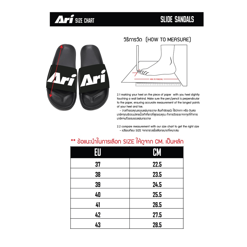ARI SLIDE SANDALS รองเท้าแตะแบบสวม แต่งด้วยโลโก้ Ari เพิ่มความโดดเด่นทุกครั้งที่สวมใส่ มาพร้อมกับพื้นรองเท้าน้ำหนักเบาช่วยซัพพอร์ตในทุกก้าวเดินตลอดทั้งวัน - UPPER ผลิตจากวัสดุสังเคราะห์คุณภาพดี มีความทนทานสูง - ด้านในบุด้วยวัสดุสังเคราะห์ที่ไม่อมน้ำ ช่วยให้ทุกสัมผัสแห้งสบาย - พื้นรองเท้าด้า