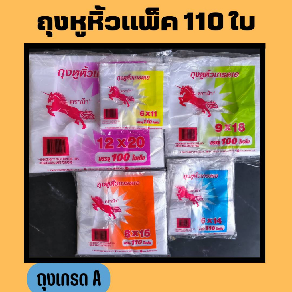 ถุงหูหิ้ว(110 ถึง 100 ใบ/1เเพ็ค) หูหิ้วบาง ตราม้า บางเหนียว