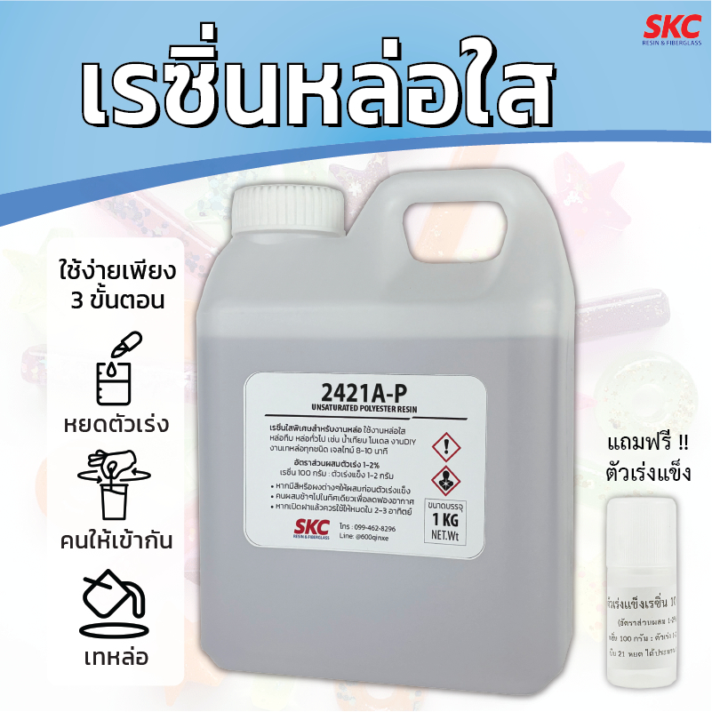 ... ส -งาน DIY ***วิธีใช้งาน*** -ผสมสีหรือผงต่างๆกับเรซิ่น แล้วคนให้เข้ากัน -นำมาผสมตัวเร่งแข็ง (MEKPO) 1-2 % -เทเรซิ่นที่ผสมแล้วลงในแม่พิมพ์ เจลไทม์ 15-18 นาที -เรซิ่นใช้เวลาแข็งตัวประมาณ 3 – 6 ชม จึงแกะออกจากแม่แบบได้ -นำชิ้นงานออกมาขัดตกแต่งให้เรียบสนิท จึงจะสามารถปัดเงาหรือพ่นด้วยสารเคลือบได้ ***ข้อควรระวัง*** -การผสมเรซิ่น ควรศึกษาคุณสมบัติ อัตราส่วน และข้อจำกัดของวัสดุที่ผสมลงไปก่อน -การเก็บเรซิ่น ควรเก็บในที่แห้งและอุณหภูมิต่ำ (ไม่ควรเกิน 28 องศาเซลเซียส) มีอากาศถ่ายเทสะดวก ไม่ควรวางใกล้แหล่งความร้อนหรือประกายไฟ เมื่อผสมเรซิ่นแล้วควรใช้ให้หมดภายใน 1-2 อาทิตย์ -เมื่อโดนผิวหนัง ให้เช็ดออกด้วยผ้าแห้ง หลังจากนั้นล้างออกด้วยสบู่ ออกใบกำกับภาษี (ลงวันที่/ไม่ลงวันที่) แจ้งรายละเอียดทางแชทเท่านั้น!!! (ไม่ทักแชท/พิมพ์ในหมายเหตุ)ทางร้านไม่ออกบิลให้ ส่งของ จันทร์-เสาร์ ตัดรอบ 12.00 น. ร้านหยุดวันอาทิตย์และวันหยุดพิเศษต่างๆ #SKCRESIN #เรซิ่นใส #rClearcastingresin #PC600S #เรซิ่นหล่อใส #น้ำยาเรซิ่นหล่อใส