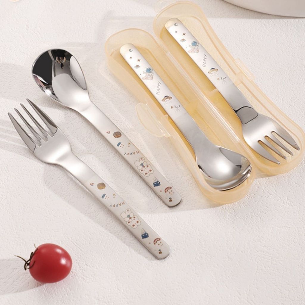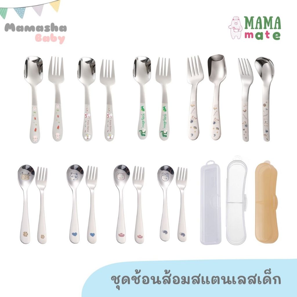 Mamamate ชุดช้อนส้อมสแตนเลสเด็ก เกรด 304 และ 316 แบบยาว ช้อนส้อมฝึกทานอาหารเด็ก ช้อนส้อมเด็กโต มีกล่องเก็บแยกขาย