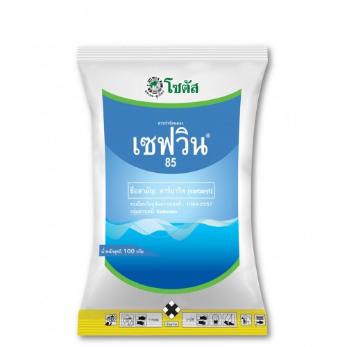 ชื่อการค้า : เซฟวิน 85 ชื่อสามัญ : คาร์บาริล (carbaryl) 85% กลุ่มสารเคมี : Carbamate กลุ่ม 1A สารกำจัดแมลง สารสำคัญ : คาร์บาริล (carbaryl) ……………………………………………..85% WP คุณสมบัติ : สารกำจัดแมลงชนิดถูกตัวตายและกินตาย กำจัดแมลงได้หลากหลายชนิดทั้ง เพลี้ยไฟ เพลี้ยแป้ง เพลี้ยอ่อน เพลี้ยจักจั่นมะม่วง หนอน