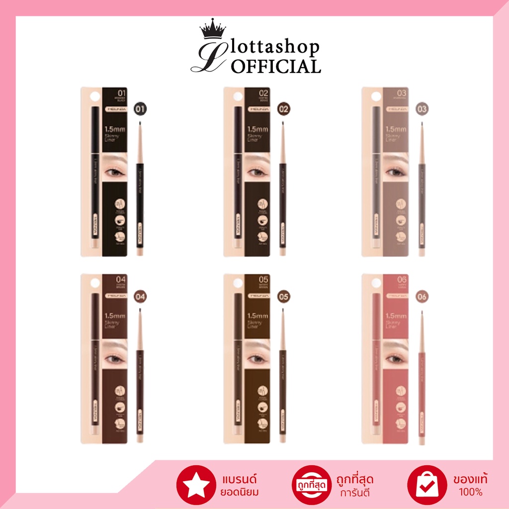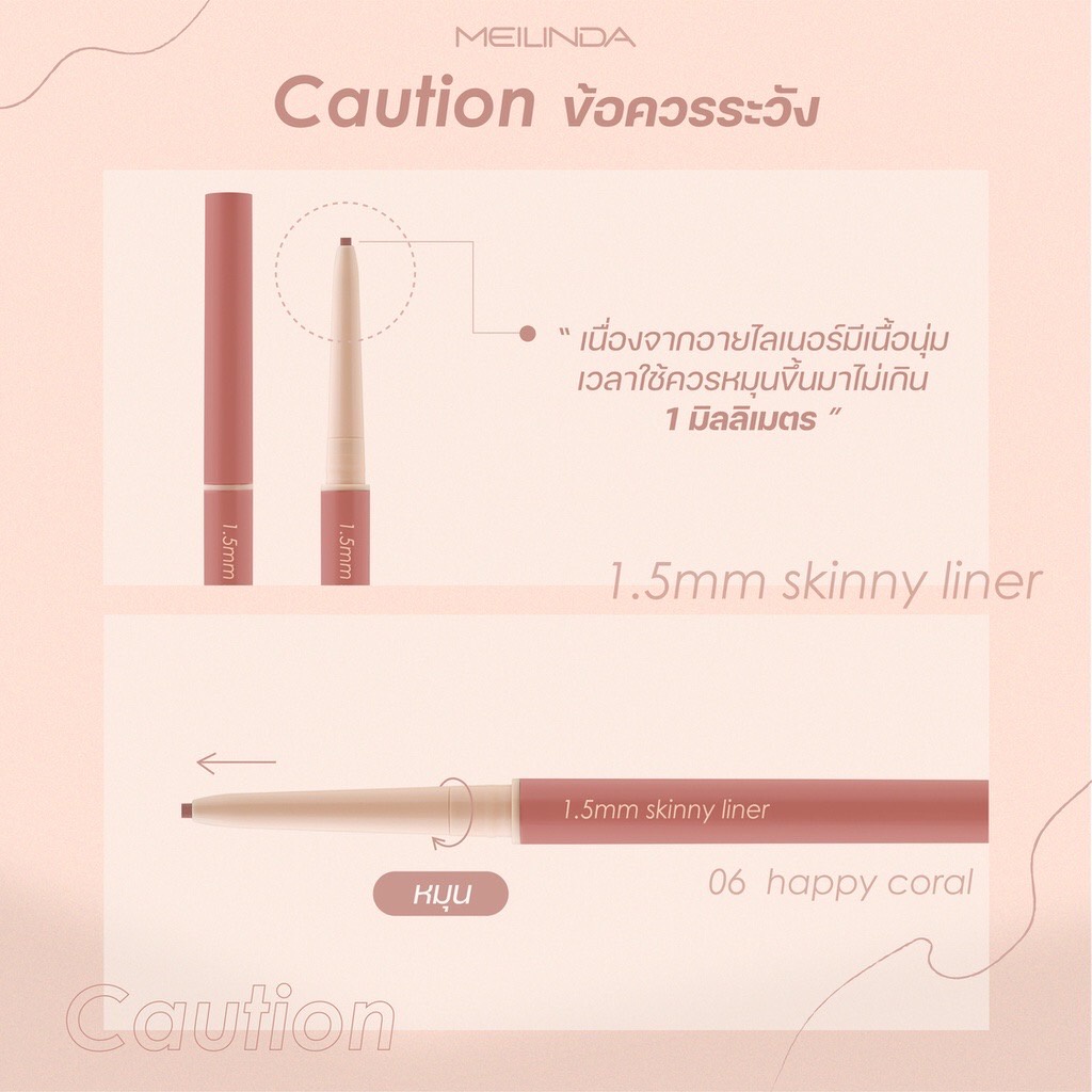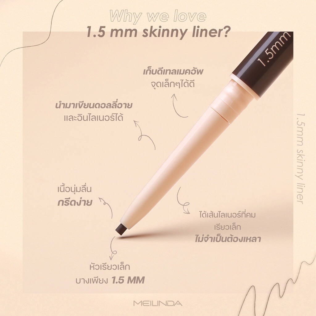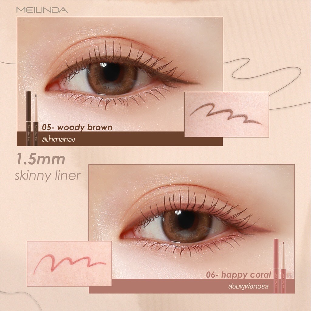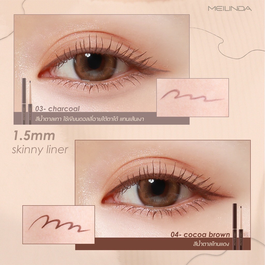 ... ✨✨✨✨ 1.5 MM Skinny Liner #perfectshape perfect line ดินสอเขียนขอบตา เส้นไลเนอร์เล็กเรียวบาง เขียนหางตาได้ง่าย ธรรมชาติแบบx10 o ดินสอเขียนขอบตาขนาด1.5 มิลลิเมตร ให้ฟินิชเส้นไลเนอร์เล็กบาง ติดทน กันน้ำกันเหงื่อ เหมาะสำหรับการเขียนหางตาให้ดูคมเฉียบ โดยไม่ต้องใช้เล็บ หรือ แปรงเป็นตัวช่วยเพิ่มเติม o ตอบโจทย์การใช้งานได้หลากหลายเช่น เขียนอายไลเนอร์ อินไลเนอร์ สร้างเงาบริเวณถุงใต้ตา เก็บรายละเอียดหางคิ้วให้มีความคม o ข้อแนะนำในการใช้งาน:เนื่องจากอายไลเนอร์มีความนุ่มและมีไส้ดินสอที่มีความบางเพียง 1.5 MM เวลาใช้งานควรหมุนขึ้นมาไม่เกิน 1 มิลลิเมตร ก็สามารถเขียนไลเนอร์ให้มีความเรียวบางและได้เส้นไลเนอร์ที่ดูคมได้โดยไม่ต้องออกแรงกด o 1.5 MM Skinny Liner มีทั้งหมด 6 โทนสี 01 Wonder Black สีดำสนิท 02 Coffee Beans สีน้ำตาลดำ 03 Charcoal สีน้ำตาลเทา 04 Cocoa Brown สีน้ำตาลโทนแดง 05 Woody Brown สีน้ำตาลทอง 06 Happy Coral สีชมพูพีชคอรัล เวลาเขียนเป็นไลเนอร์จะทำให้ตาดูคมขึ้นแต่ไม่เห็นเส้นที่ชัดเจน สามารถใช้เขียนแทนอายไลเนอร์เพื่อเพิ่มความคมให้ดวงตาได้โดยยังคงความเป็นธรรมชาติมาก หรือสามารถใช้ในการเขียนโครงดอลลี่อายใต้ตา