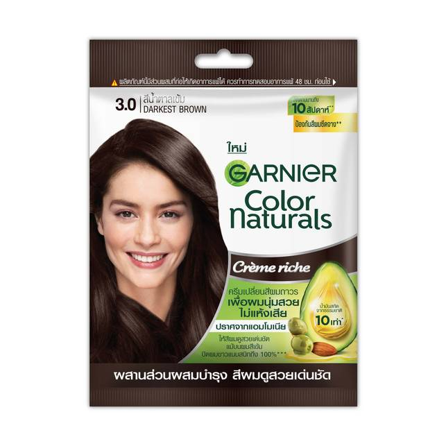 การ์นิเย่ คัลเลอร์ แนทเชอรัลส์ ครีมเปลี่ยนสีผมเพื่อสีผมดูสวยเด่นชัดแม้บนผมสีเข้ม สามารถล็อกสีผมให้ติดทนนานได้ถึง 10 สัปดาห์ ผสานพลังจากน้ำมันธรรมชาติ 10 เท่า เพื่อผมดูนุ่มสวยไม่แห้งเสีย ปราศจากแอมโมเนีย กลิ่นหอม ปิดผมขาวแนบสนิทถึง 100% แสดงผลมากขึ้น ขนาด 30 กรัม + 30 มล. วิธีใช้งาน 1. ใส่