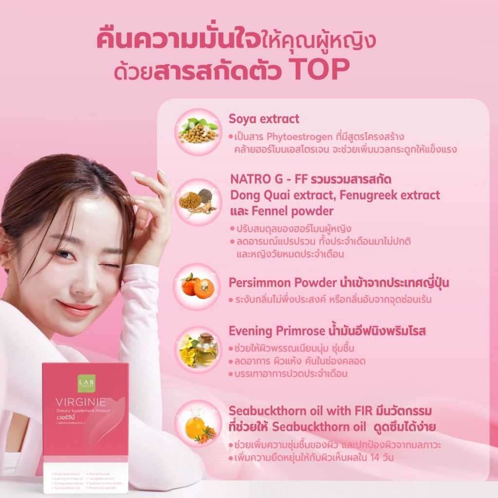 Library Virginie - ผลิตภัณฑ์ช่วยบำรุงระบบภายในเพศหญิง 1 กล่องมี 30 แคปซูล ข้อมูลสำหรับผู้แพ้อาหาร : มีผลิตภัณฑ์จากถั่วเหลือง Food allergen information : Contains Soy Bean ควรกินอาหารหลากหลายครบ 5 หมู่ ในสัดส่วนที่เหมาะสมเป็นประจำ Should eat varieties of five categories food in appropriate pr