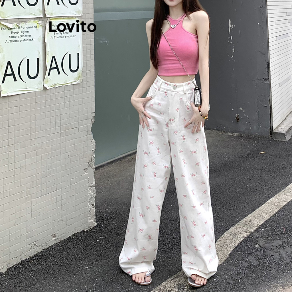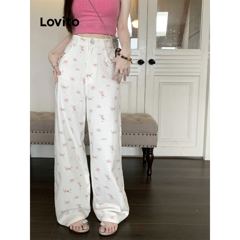 Lovito กางเกงผู้หญิง ลายดอกไม้ สไตล์ลำลอง LNA30046 (สีขาว)