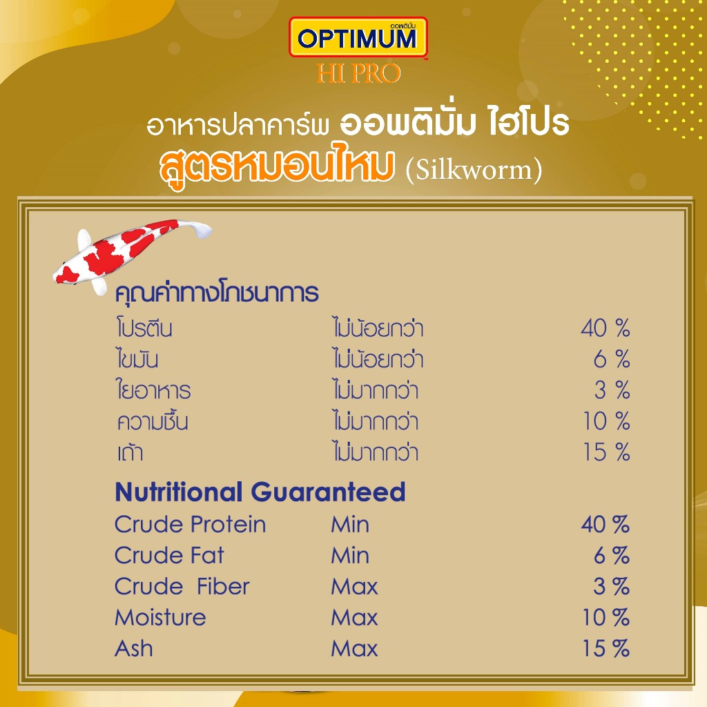 ... เร็ว ปรับสมดุลของสารอาหารช่วยในเรื่องการพัฒนาโครงสร้างของปลาคาร์พให้ใหญ่ ล่ำ และสวยงาม -บีตากลูแคนและแมนแนน โอลิโกแซ็กคาไรด์ ซึ่งส่งผลดีต่อระบบทางเดินอาหารและระบบภูมิคุ้มกันของปลาคาร์พ ทำให้ปลามีสุขภาพที่ดี -อุดมไปด้วยวิตามินซี และวิตามินอี ช่วยในการลดความเครียด ช่วยเพิ่มภูมิคุ้มกันที่ทำให้ปลาสามารถต่อต้านเชื้อโรคที่จะเข้าสู่ร่างกาย -อาหารปลาสูตรพิเศษสำหรับปลาคาร์พที่ประกอบด้วยสารอาหารที่มีความเหมาะสมต่อความต้องการของปลา ลดการสะสมของไขมันส่วนเกินที่ทำให้ปลาไม่อ้วนผิดรูปทรง -ช่วยลดโอกาสการเกิดน้ำเสีย ใช้แล้วน้ำไม่ขุ่น -เม็ดอาหารมีลักษณะกลม size M ขนาดประมาณ 5-6mm. จึงเหมาะกับปลาคาร์พที่มีขนาดตั้งแต่ 10 นิ้วขึ้นไป -ควรให้อาหารวันละ 2-4 ครั้ง โดยโรยบนผิวน้ำในปริมาณที่เพียงพอ สมดุลกับจำนวนปลาคาร์พ ให้ปลากินหมดภายในเวลาประมาณ 5 นาที และไม่ควรให้อาหารปลามากเกินไป หากปลากินไม่หมดควรตักออก เพราะอาหารที่เหลือจากการกินไม่หมดจะทำให้น้ำขุ่นและคุณภาพน้ำลดลง Optimum Hi Pro ™ Silkworm Carp Fish Food is a special formulation for all carp. It is nutritionally complete and balanced with high quality protein from natural Silkworm, vitamins and minerals. -High quality protein source from natural Silkworm to promote growth. Balanced nutrition for excellent conformation. -Beta-glucan & Mannan oligosaccharide to improve gastrointestinal health and immune system for overall health. -Rich in vitamins C and E to help reduce stress and increase immunity. -Specially formulated for complete and balanced nutrition to keep your koi healthy and to help reduce fat deposition. Kibbe size 5-6 mm. Feed 2 - 4 times daily. Sprinkle just enough food that the fish can consume within 5 minutes. Do not overfeed because unconsumed food will reduce water quality (to the detriment of your fish). Non - water fouling Floating Type