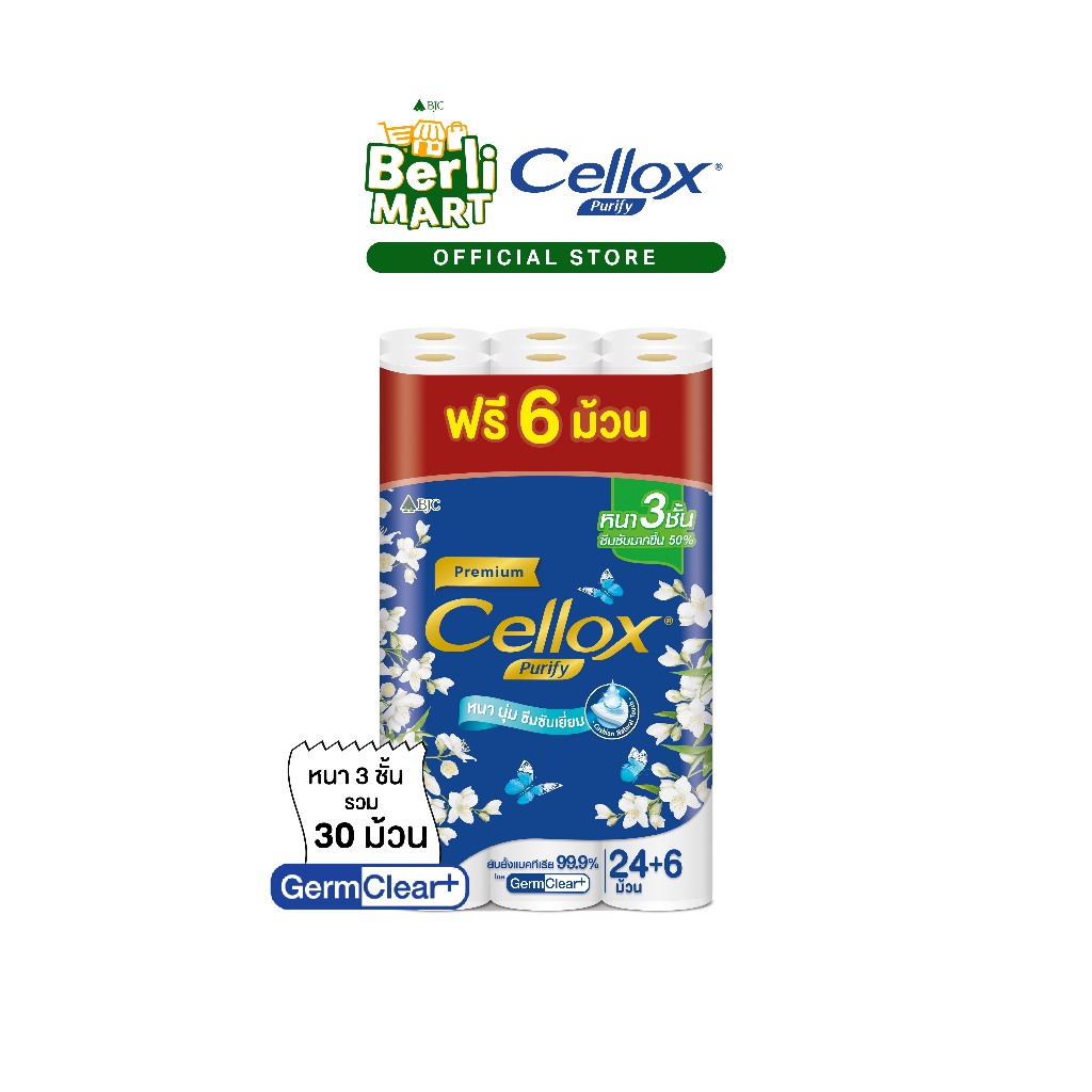 เซลล็อกซ์พิวริฟาย พรีเมี่ยม24 ม้วน ฟรี 6 ม้วน Cellox Purify Premium 24+6'R ทิชชู๋ม้วน หนา 3 ชั้น Toilet Tissue 3 ply