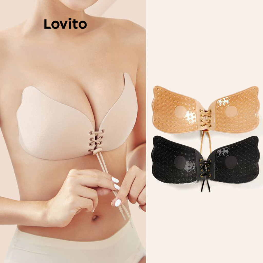 Lovito อุปกรณ์เสริมเสื้อชั้นใน บราปีกนก ติดแน่น ดันทรง ไม่มีสาย มองไม่เห็น สีพื้น สไตล์ลำลอง LNA27412 (แอปริคอท/ดำ)
