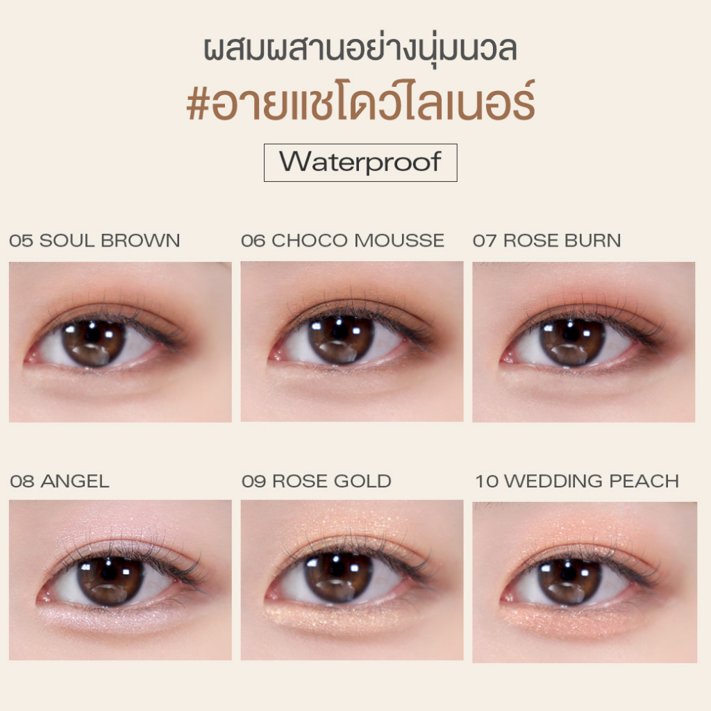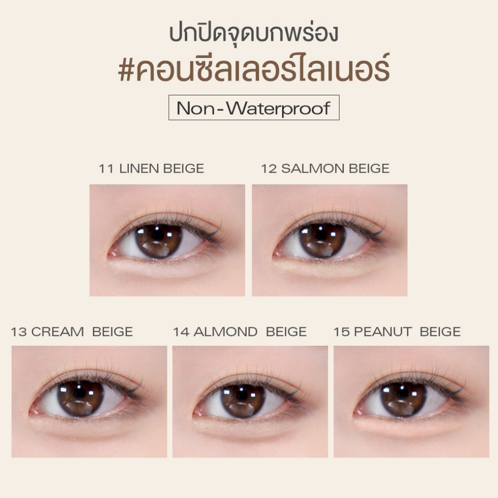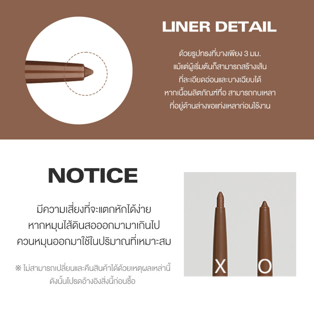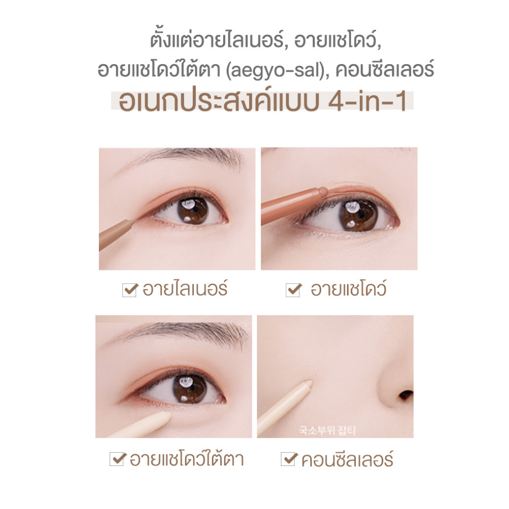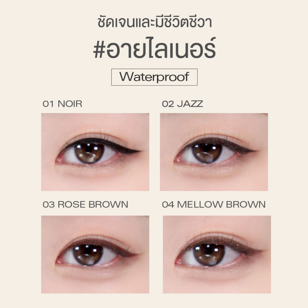 ... 2 Jazz สีน้ำตาลเข้ม ให้ดวงตากลมโต ดูโดดเด่น #03 Rose Brown สีน้ำตาลแดง ให้ดวงตาดูนุ่มนวล อ่อนโยน #04 Mellow Brown สีน้ำตาลธรรมชาติ ครีมมี่สีทองประกายมุก #05 Soul Brown สีน้ำตาลมืด ช่วยให้ดวงตาดูอ่อนโยน #06 Choco Mousse สีน้ำตาลอ่อน ดูเป็นธรรมชาติ #07 Rose Burn สีน้ำตาลโครอล ราวกับร้องไห้มา #08 Angel สีชมพูแชมเปญ ช่วยให้ดูมีถุงใต้ตาแบบธรรมชาติ #09 Rose Gold สีทองเบจ ช่วยให้ดวงตาดูสว่างวิบวับ #10 Wedding Peach สีพีชแชมเปญ ดูเหมือนมีน้ำตาคลอนิดๆ #Eyeliner #Bbia วิธีใช้ : 1.กำจัดความมันบริเวณรอบดวงตา โดยการทาแป้งให้ทั่วบริเวณรอบดวงตา 2.หมุนอายไลเนอร์ออกมาอย่างพอเหมาะ เพียง 1 - 2 มิลลิเมตร 3.เขียนอายไลเนอร์ในบริเวณที่ต้องการ 4. ควรเปิดฝาอายไลเนอร์ให้แน่นสนิททุกครั้งหลังใช้ Q : เนื้อเจลทู่ A : Last Auto Gel Eyeliner เป็นอายไลน์เนอร์ชนิดหมุน Auto type เมื่อเนื้อเจลทู่ ให้ทำการเหลาโดยใช้กบเหลาที่อยู่ภายในแท่ง บริเวณปลายด้ามในการเหลา ซึ่งวิธีการเหลา ควรเหลาเนื้อเจลให้เหมือนกับครั้งแรกที่ใช้ ไม่ควรเหลาแหลมเกินไป เพื่อความสะดวก และให้ได้สีที่สวย เวลาใช้ หากกบเหลามีคราบเปื้อน ให้ทำความสะอาดโดยใช้ Remover เช็ดออก Q : อยู่ดีๆก็เขียนไม่สวย A : หลังจากการใช้งาน Last Auto Gel Eyeliner เสร็จแล้วควรปิดให้สนิท หากเปิดผาทิ้งไว้ จะทำให้อากาศเข้าไปด้านใน และทำให้เจลแห้ง แข็ง ไม่อ่อนนุ่มเหมือนเดิมเวลาเขียน จะทำใฟ้ลายเส้นที่ไม่สวยดังเดิม ดังนั้น หลังจากใช้งานเสร็จแล้ว ควรปิดฝาผลิตภัณฑ์ และเก็บเข้าที่ให้เรียบร้อย Q : เนื้อเจลไม่เนียนสวยเป็นคราบ A: เนื่องด้วยแต่ละบุคคลมีสภาพผิวที่แตกต่างกัน ทำให้การใช้งานผลิตภัณฑ์ แตกต่างกันออกไป ในกรณีที่บริเวณรอบดวงตามีความมัน หรือมีคราบเหงื่อ เพื่อให้ดวงตามีสีสวย ติดทนนานตลอดวัน ก่อนเขียนอายไลเนอร์ ให้ใช้ Foundation หรืออายแชโดว์ก่อน หากบริเวณรอบดวงตาเป็นคราบเลอะ ให้ใช้บลัชในการเช็คคราบอายไลน์เนอร์ออก Q : ทำความสะอาดอย่างไร A : สามารถทำความสะอาดได้โดยการใช้ Lip & Eye Remover, Cleansing oil หรือ Remover สำหรับทำความสะอาดผลิตภัณฑ์แบบกันน้ำ Q : ล้างอายไลน์เนอร์ไม่ออก รู้สึกเหมือนมีคราบแข็งติดอยู่รอบดวงตา A : เนื่องด้วย Last Liner มีคุณสมบัติพิเศษ ที่ติดแน่น ทนทาน ไม่หลุดลอกระหว่างวัน ทำให้ผู้ใช้ที่เคยใช้อายไลน์เนอร์ชนิดอื่นมาก่อน มีความรู้สึกว่าคราบอายไลน์เนอร์ล้างออกยาก สำหรับอายไลน์เนอร์ชนิด Multiproof สามารถทำความสะอาดได้โดยใช้ Cleanser สำหรับทำความสะอาดผลิตภัณแบบกันน้ำ แต่อาจต้องใช้เวลาในการทำความสะอาด เนื่องด้วยเนื้อเจลมีคุณสมบัติทนทาน แนะนำให้ใช้ Cleansing Remover สำหรับผลิตภัณฑ์แบบกันน้ำ ในการความสะอาดเนื่องจาก Cleansing มีคุณสมบัติในการชำระสิ่งสกปรกได้