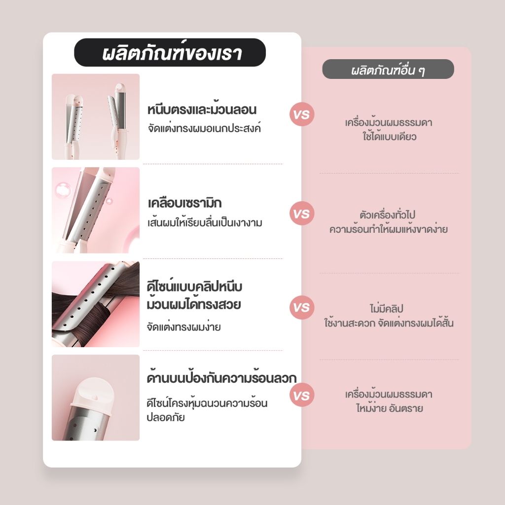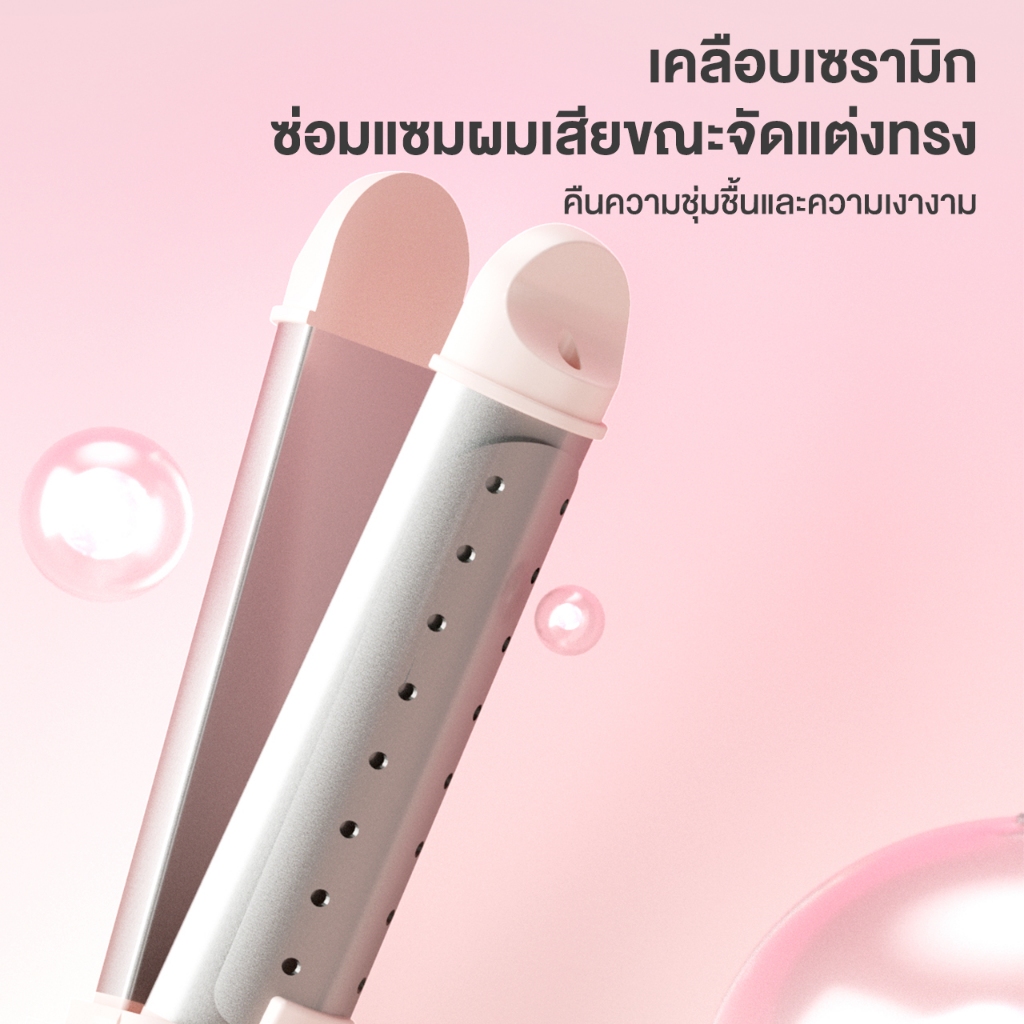 * หนีบตรงและม้วนลอน 2 in 1 , เปิดง่ายในคลิกเดียว , สลับได้หลากหลายสไตล์ * แผ่นทำความร้อนเส้นผ่านศูนย์กลาง 28 มม. ปรับอุณหภูมิได้ 2 ระดับ , เหมาะสำหรับทุกสภาพเส้นผม , ทำลอนง่าย * เคลือบเซรามิค แทรกซึมทีละชั้น , ทำให้ผมเรียบลื่นเป็นเงางาม โดยไม่ทำลายสีผม * ให้ความร้อนแบบพัลส์ ร้อนเร็วใน 10 วินาที