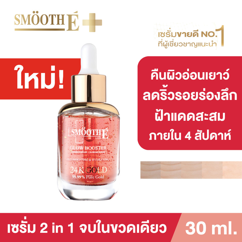 Smooth E Gold 24k Glow Booster Anti-Aging Supreme Serum 30ml. ใหม่!! เซรั่มสูตรเข้มข้นที่ได้คัดสรรส่วนผสมจากทั่วทุกมุมโลก บำรุงผิวที่ทรงประสิทธิภาพ คิดค้นร่วมกับผู้เชี่ยวชาญด้านการดูแลผิวหน้าเด็กของคนไทยมานานกว่า 30 ปี ผ่านการทดสอบภายใต้การควบคุมของแพทย์ผิวหนังว่าอ่อนโยน เหมาะกับทุกสภาพผิ