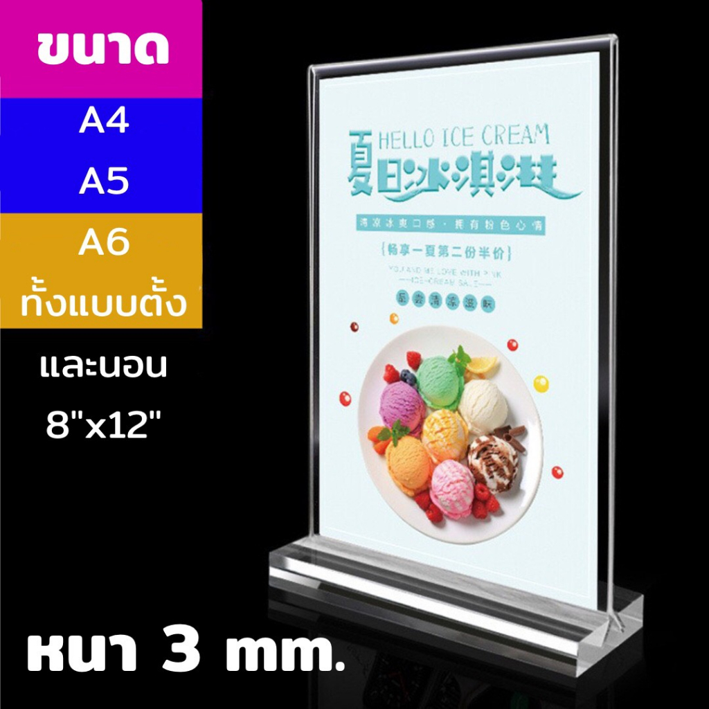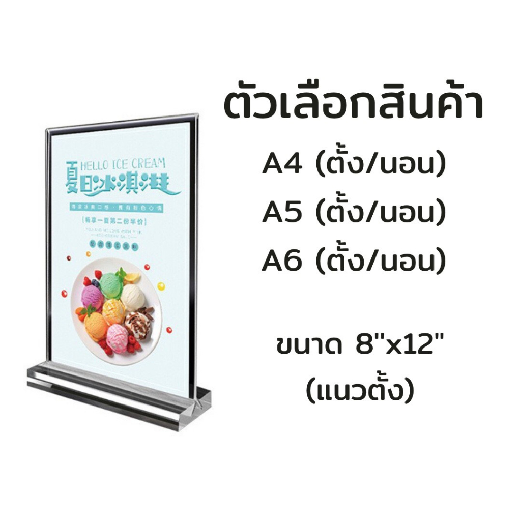 ... ามารถถอดออกได้ โดยเลื่อนสลับกับตัวอะคริลิค 📝 สำหรับใส่เมนูอาหาร เครื่องดื่ม โบรชัวร์ และเอกสารอื่นๆ ไว้สำหรับโชว์ *** แนวตั้ง มี 4 ขนาด ✔️แผ่นอะคริลิค A4 ตั้ง สูง 29.7 x กว้าง 21 cm ✔️แผ่นอะคริลิค A5 ตั้ง สูง 21 x กว้าง 14.8 cm ✔️แผ่นอะคริลิค A6 ตั้ง สูง 15 x กว้าง 10 cm. ✔️แผ่นอะคริลิค 5”x7” ตั้ง 129>>49 *** แนวนอน มี 4 ขนาด ✔️แผ่นอะคริลิค A4 นอน A4 สูง 21 x กว้าง 29.7 cm ✔️แผ่นอะคริลิค A5 นอน สูง 14.8 x กว้าง 21 cm ✔️แผ่นอะคริลิค A6 นอน สูง 10 x กว้าง 15 cm.