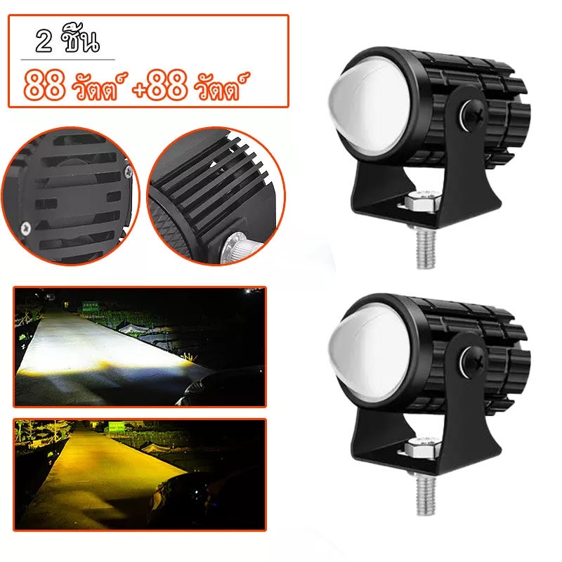 แพ็ค 2ชิ้น ไฟโปรเจคเตอร์ ไฟหน้ารถยนต์LED ไฟท้าย ไฟสปอร์ตไลท์มอเตอร์ไซค์ สว่างมาก 2 สเต็ป (เเสงสีขาว+แสงสีส้ม) 88W LED