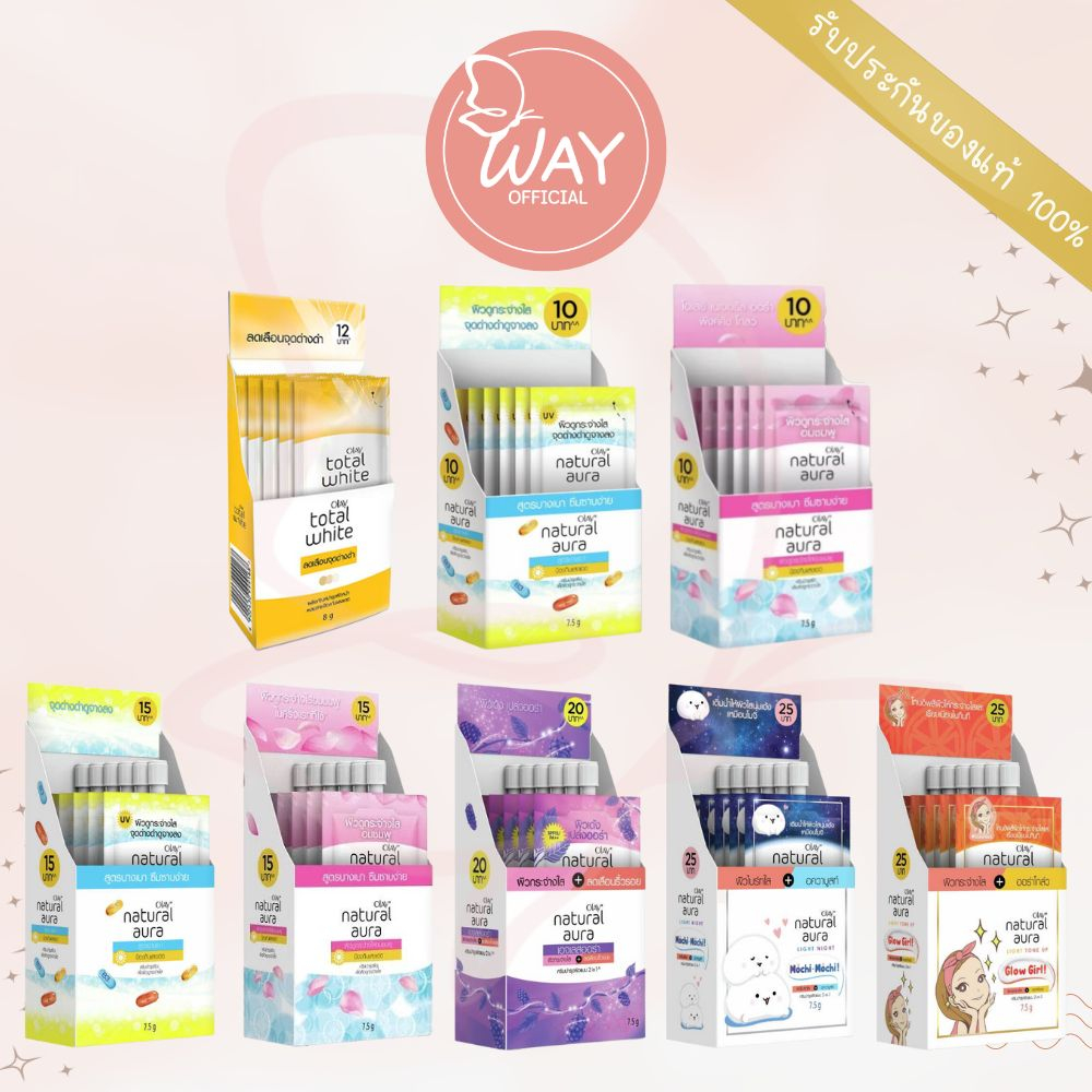 ... เสมอที่สะสมมาเป็นเวลายาวนาน 💖 Olay Natural Aura Pinkish Glow 7.5g ครีมบำรุงผิวเพื่อผิวดูกระจ่างใส เนื้อเบาบาง ซึมซาบเร็ว ไม่เหนียวเหนอะหนะ อุดมด้วยสารสกัดจากนม และกุหลาบฝรั่งเศส ช่วยปรับสีผิวให้ดูสม่ำเสมอ พร้อมปกป้องผิวจากแสงแดด 💜 Olay Natural Aura Ageless Aura 7.5g ครีมบำรุงผิว อุดมด้วยสารสกัดจากมัลเบอร์รี่ ช่วยปรับสีผิวให้ขาวกระจ่างใสขึ้น ลดเลือนริ้วรอยร่องลึก พร้อมปกป้องผิวจากแสงแดดด้วย SPF15 PA++ 💙 Olay Natural Aura Light Night Mochi-Mochi 7.5g มีสารสกัดจากดอกไวท์ลิลลี่และ Niacinamide ช่วยให้ผิวไบร์ทใส ชุ่มชื้น นุ่มเด้ง เหมือนโมจิแบบสาวญี่ปุ่น ครีมบำรุงผิวแบบ 2 in 1 ที่ช่วยทั้งผิวไบร์ทใส เปล่งปลั่ง และยังเติมน้ำให้ผิว คงความชุ่มชื้นให้ผิวได้ตลอดทั้งคืน แถมช่วยลดจุดด่างดำให้สีผิวสม่ำเสมอ 🧡 Olay Natural Aura Light Tone Up Glow Girl 7.5g มีสารสกัดหลักจากเกรปฟรุตและ Niacinamide หรือวิตามินบี 3 ช่วยอัพผิวให้กระจ่างใสดูมีออร่าได้แบบสาวเกาหลี ใช้เป็นสกินแคร์เตรียมผิวก่อนแต่งหน้าได้เลย จะช่วยโทนอัพสีผิวที่ดูหมองคล้ำให้ไบร์ทขึ้น เติมความชุ่มชื้น ลดเลือนจุดด่างดำ แถมยังปกป้องผิวจากแสงแดด 💛 Olay Total White Spot Cream 8g ครีมบำรุงที่ช่วยให้จุดด่างดำและรอยแผลเป็นจากสิวดูจางลง ช่วยป้องกันผิวจากรังสียูวีเอและยูวีบีจากแสงแดด พร้อมส่วนผสมของสารป้องกันแสงแดดที่ช่วยป้องกันรังสียูวี โดยไม่ทำให้ผิวเหนียวเหนอะหนะ มีส่วนผสมของวิตามินบี 3 และสารสกัดจากผลไม้ ปริมาณ 7.5 กรัม [กล่อง x6 ซอง] วิธีใช้ ทาให้ทั่วใบหน้าและลำคอที่สะอาดเป็นประจำทุกวัน 💛 กด "+" ติดตาม ร้าน ไว้รู้โปรโมั่นก่อนใคร 💛 เลื่อนรูปดูซ้าย - ขวาได้นะคะ 💛 สินค้า ของแท้ 100% ทางร้านรับจากบริษัทโดยตรงค่ะ 💛 สินค้า แพคกันกระแทกอย่างดี 💛 สินค้าพร้อมส่งทุกรายการค่ะ
